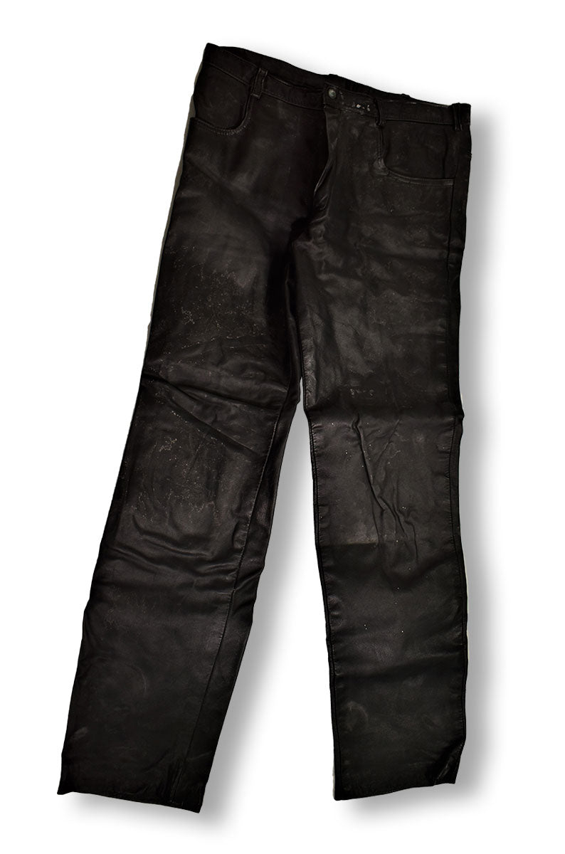 Black leather pants featuring leather cross-stitching down the legs, unhemmed cuffs, leather lace-up fly, a spade design stitched on the knees, and cross-stitched leather on back pockets. A timeless rock-n-roll a staple. From the Joe Elliott collection.