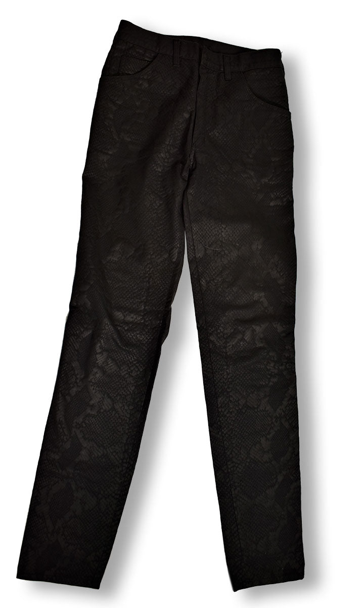 Vintage ModZart snakeskin pants in what else? Black of course! John Dove and Molly White, the London designers behind the ModZart brand, dressed rock and punk icons from Debbie Harry to Iggy Pop to Joe Elliott himself, so these babies come with some serious pedigree. From the Joe Elliott collection.