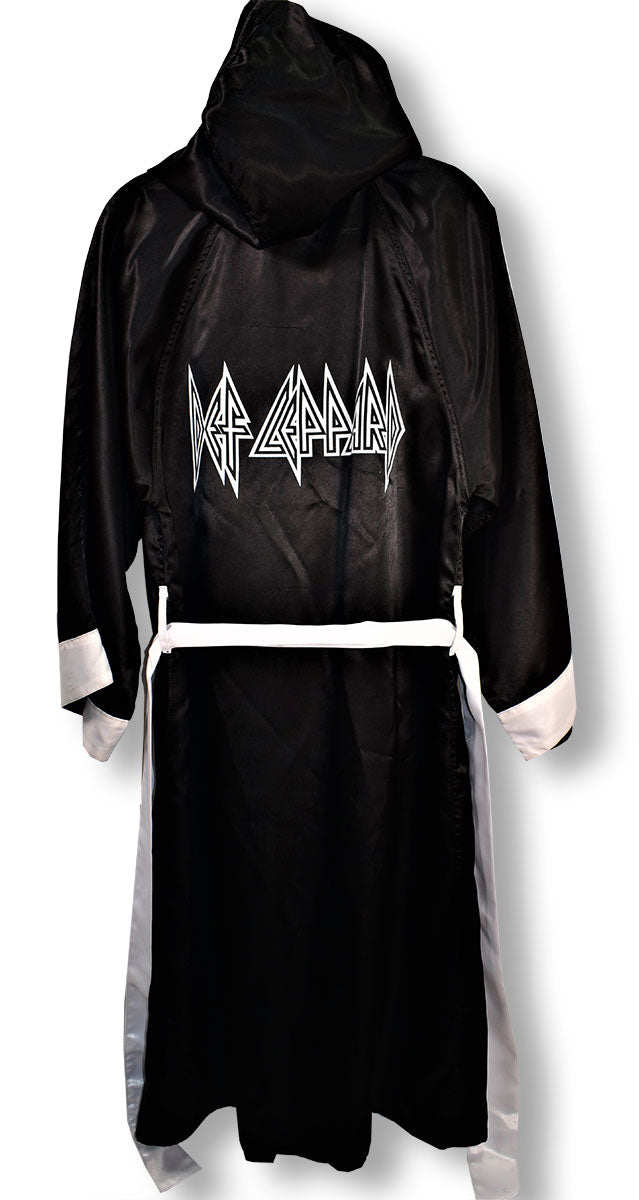 In this corner, a hooded black boxing robe by Pro Boxing Supplies with white trim, cuffs, and belt customized with "Def Leppard" printed in white on the back. From the Phil Collen collection.