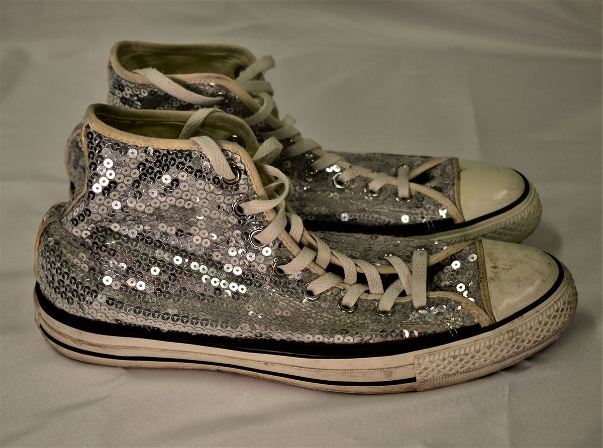 What does rock-in-royalty wear, on their feet? Silver-sequined Chucks, of course! These much loved Converse Chuck Taylor All Stars belong to Joe Elliott. He is still wearing these today and has been for the last 10 years! From the Joe Elliott collection.