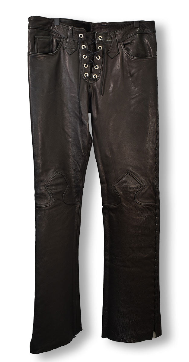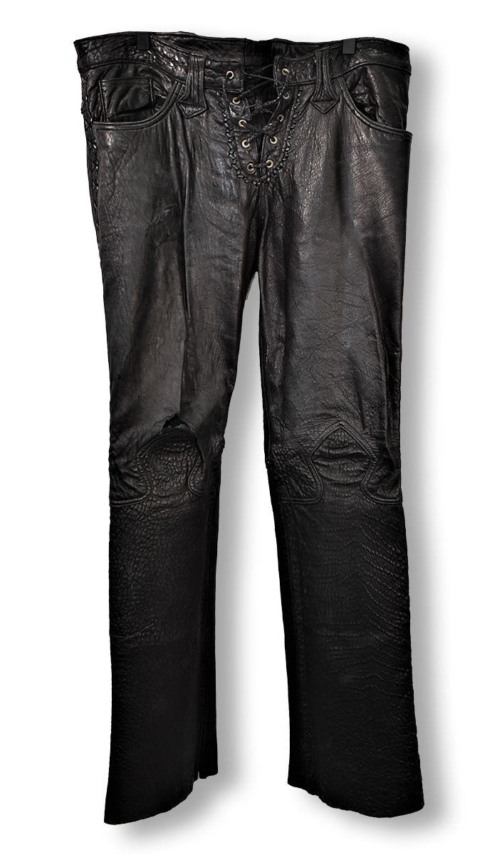 Black leather pants featuring leather cross-stitching down the legs, unhemmed cuffs, leather lace-up fly, spade design stitched on the knees, and cross-stitched leather on back pockets. From the Joe Elliott collection.