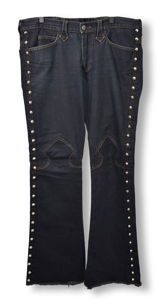 Blue jeans from Lords with rounded studs down the outside of both legs, gold stitching, spade-shaped design stitched on knees, stylized belt loops, and branded buttons. From the Joe Elliott collection.