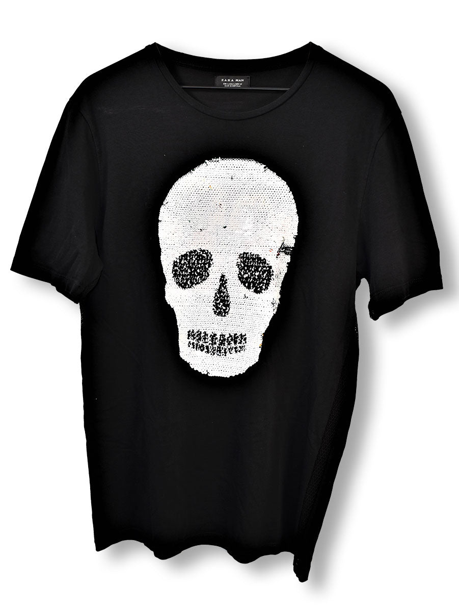 Black Zara t-shirt featuring fishnet design down the sides, and floral double-faced sequin skull in white on the front. Fishnet, sequins, and skulls - that's a whole lot of glam for just one T-shirt. Worn 2015. From the Joe Elliott collection.