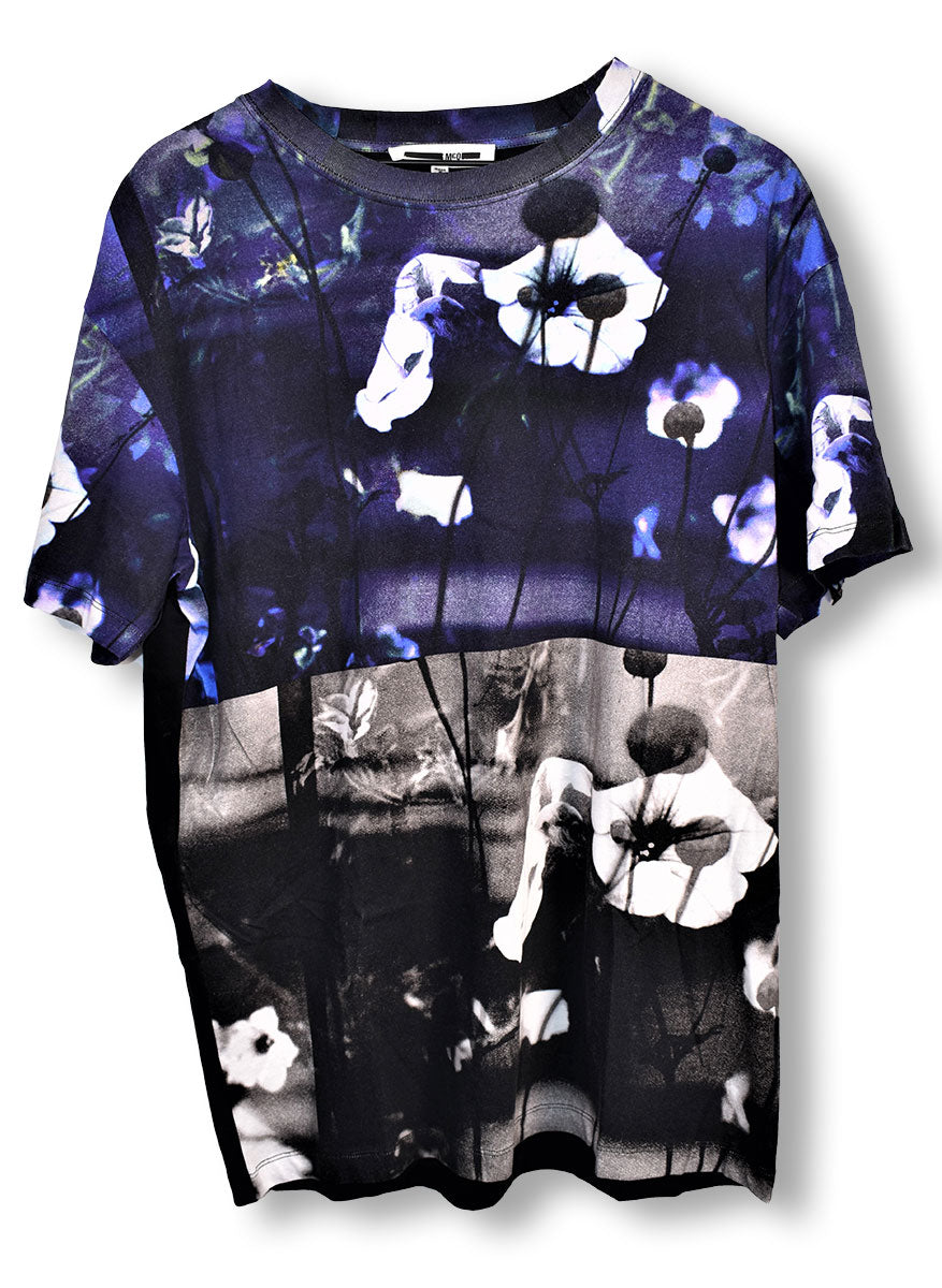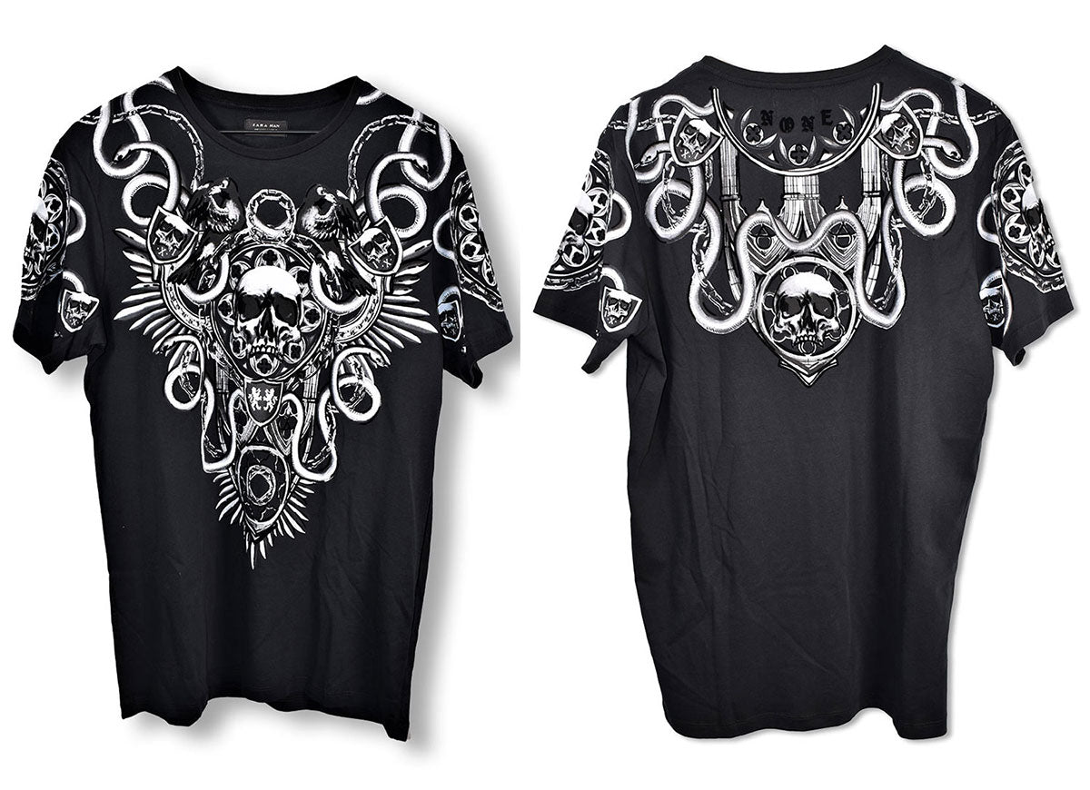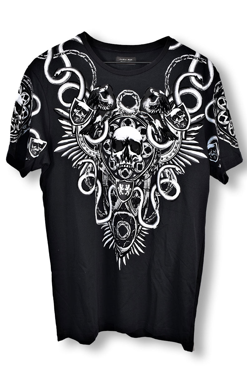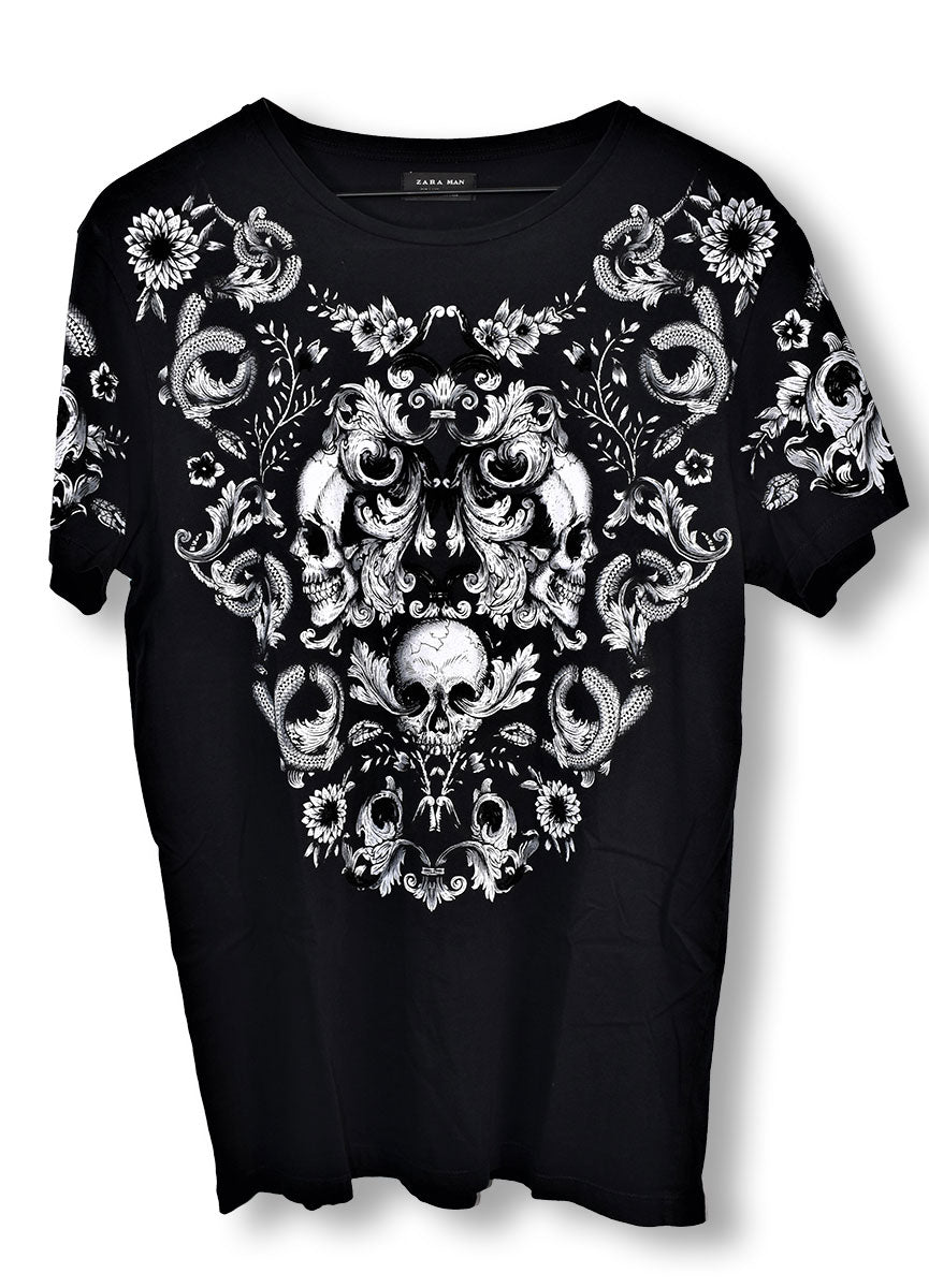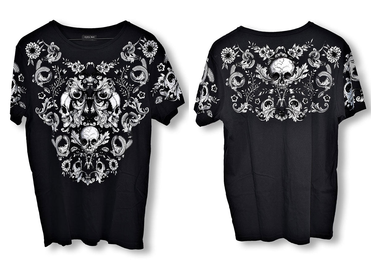 Joe Elliott's Zara brand black tee with white design of flowers, skulls, n' snakes across the front and back. Worn in 2008/09. From the collection of Joe Elliott.