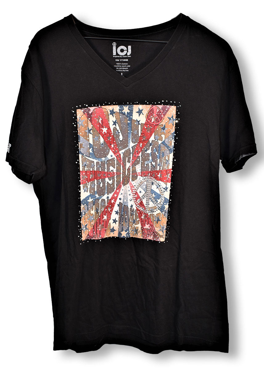 Joe Elliott's black ICJUK (Inspired by Claire Jane UK) t-shirt featuring rhinestones, red, white, and blue stars, and peace signs reading "ICJ UK music fest peace, love, rock Sat-Sun: ICJUK 2012." Worn in 2013 and at Vegas residency.