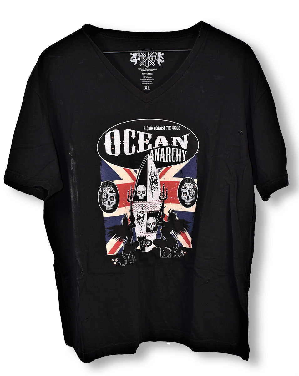 More ICJUK brand from Joe Elliott's closet, this time a black Ocean Anarchy t-shirt featuring the silhouette of a woman making up the white "OA" on the front. Worn in 2005. From the Joe Elliott collection.