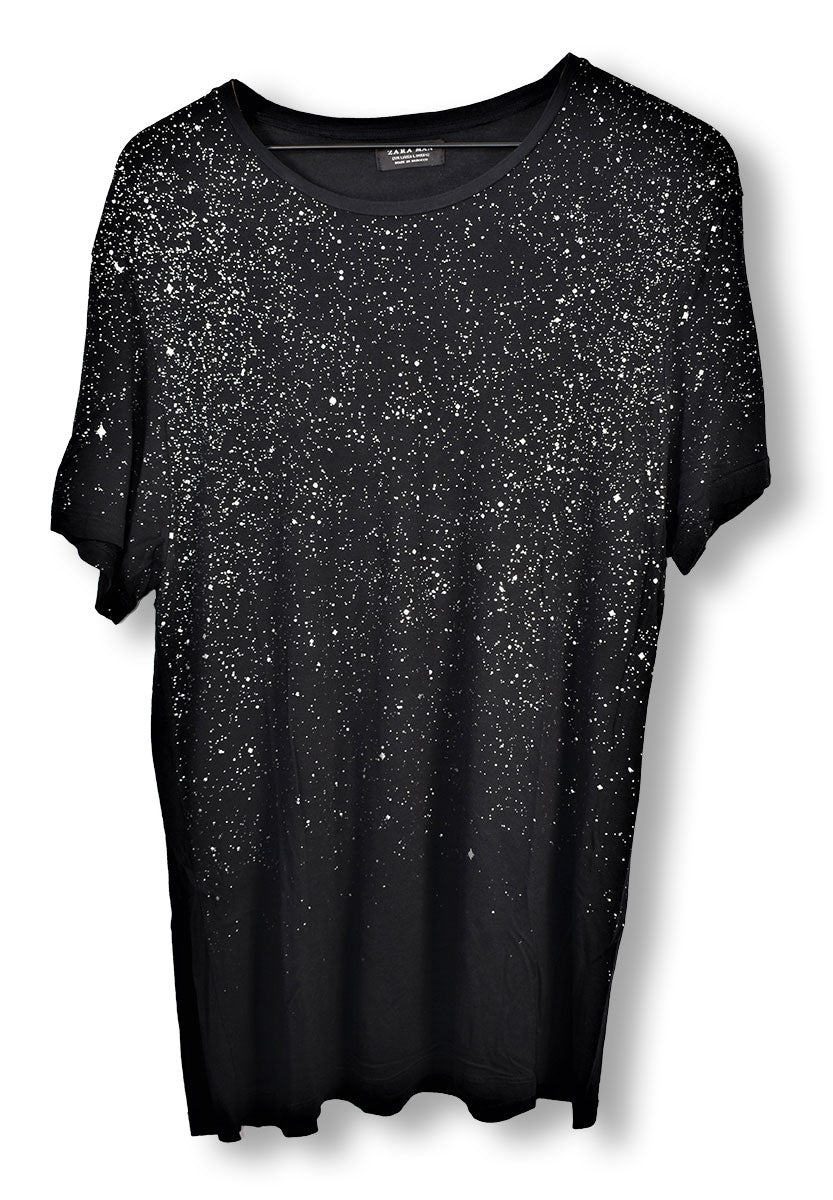 Joe Elliott's stylish black t-shirt by Spanish fashion brand Zara features a silver speckled design. Worn in 2014/15. From the Joe Elliott collection.