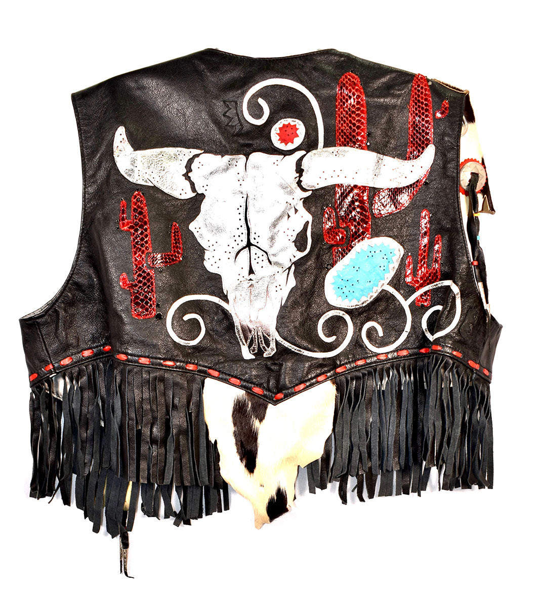 Wild west meets rockin' 80s London. From iconic London designer Kim Hadleigh, this black leather, fringed waistcoat features cowhide flap and steel star accents on the front and silver-stitched cow skull, red mock-snake skin, and cactus on the back. From the Rick Allen collection.