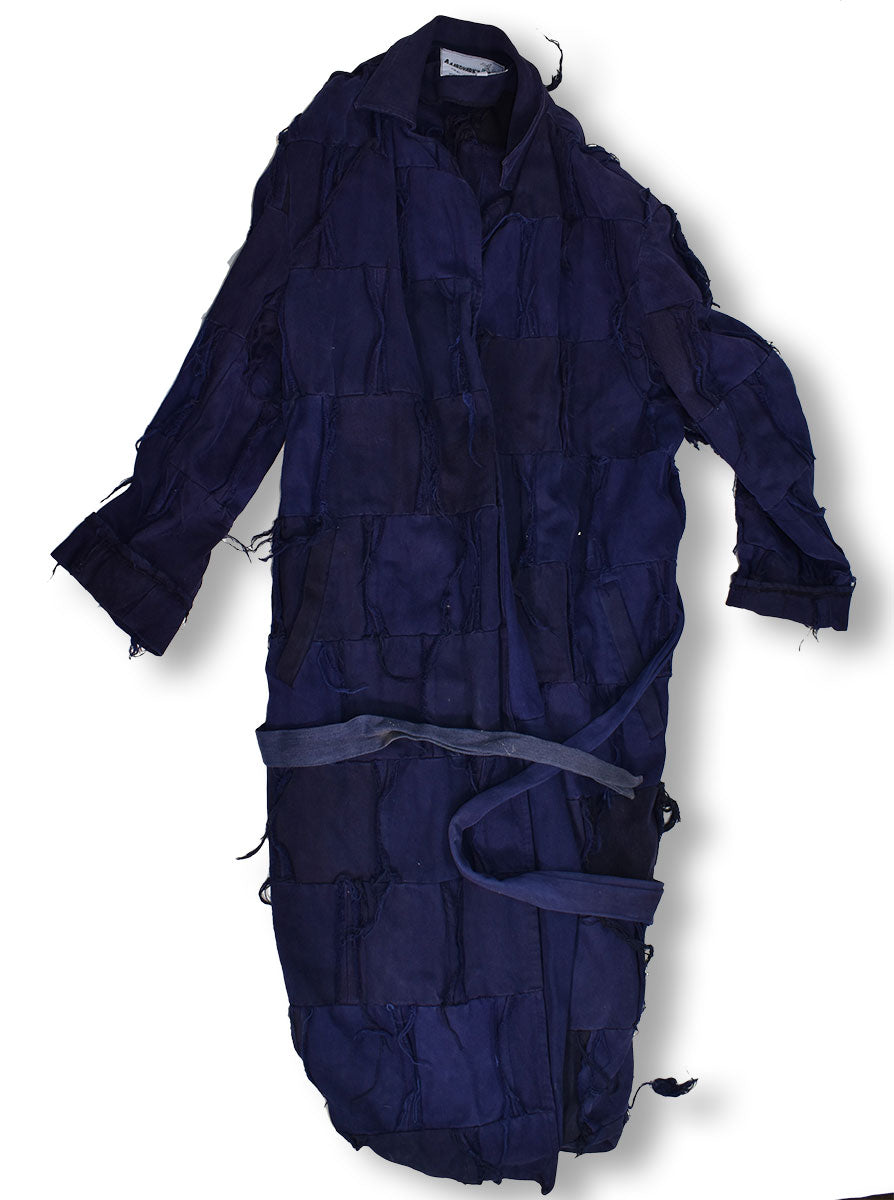 Joe's super-frayed patchwork-style trench worn at the 1992 MTV VMA Awards. This Aardvark Apparel 3/4 length coat has been through some adventures. Note the well-worn robe-style belt, and the significant burn hole straight through on the back close to the hem. Pyromania, anyone? From the Joe Elliott collection.