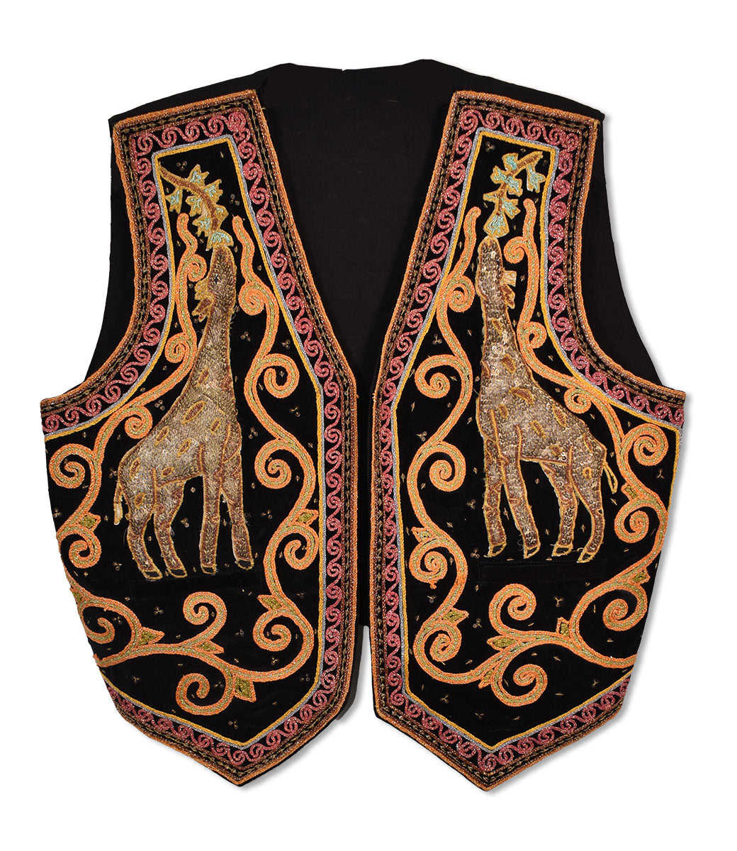 Rick Allen's African-inspired waistcoat featuring intricate orange, pink, blue, brown, and gold embroidery. A pair of embroidered giraffes on the front, scorpion with pink oval-shaped details on the back. From the collection of Rick Allen.