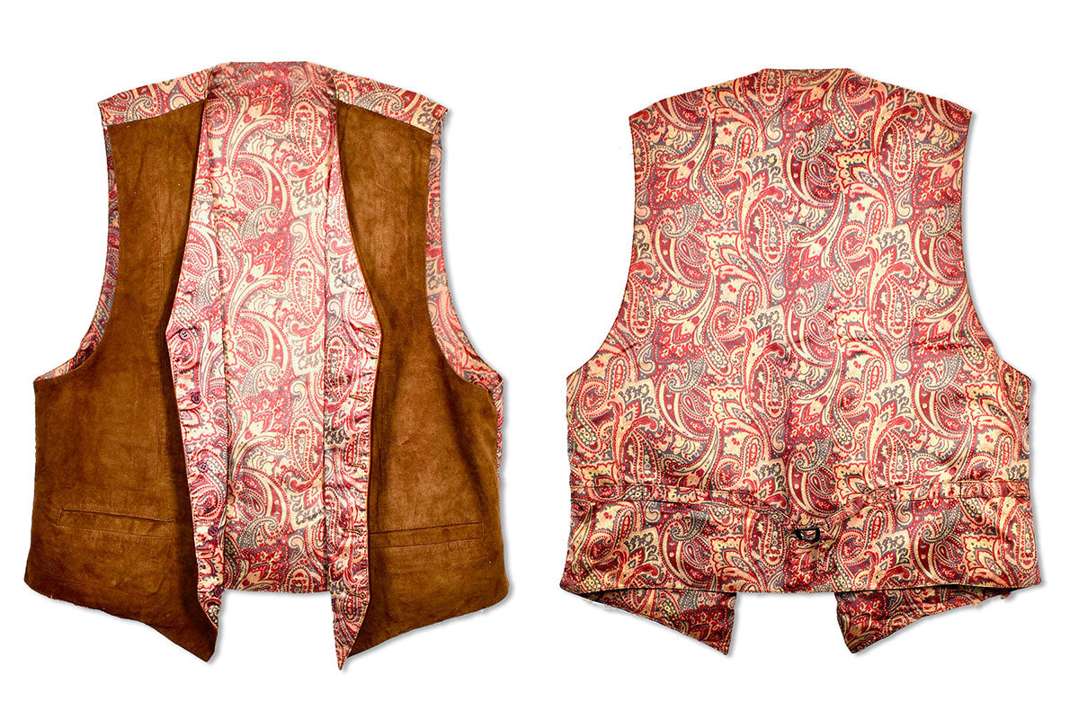 Rick Allen's brown leather 5-button waistcoat with paisley back and lining. Well-worn in, but still in good condition. From the collection of Rick Allen.