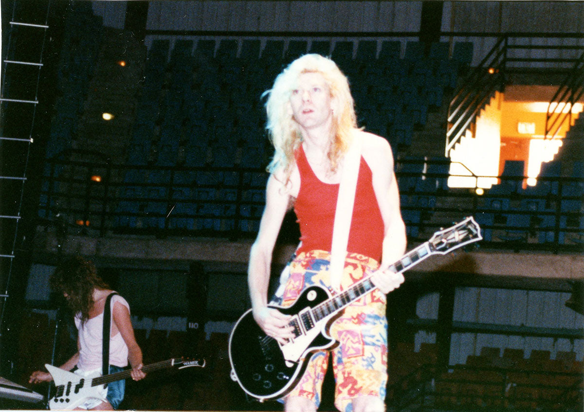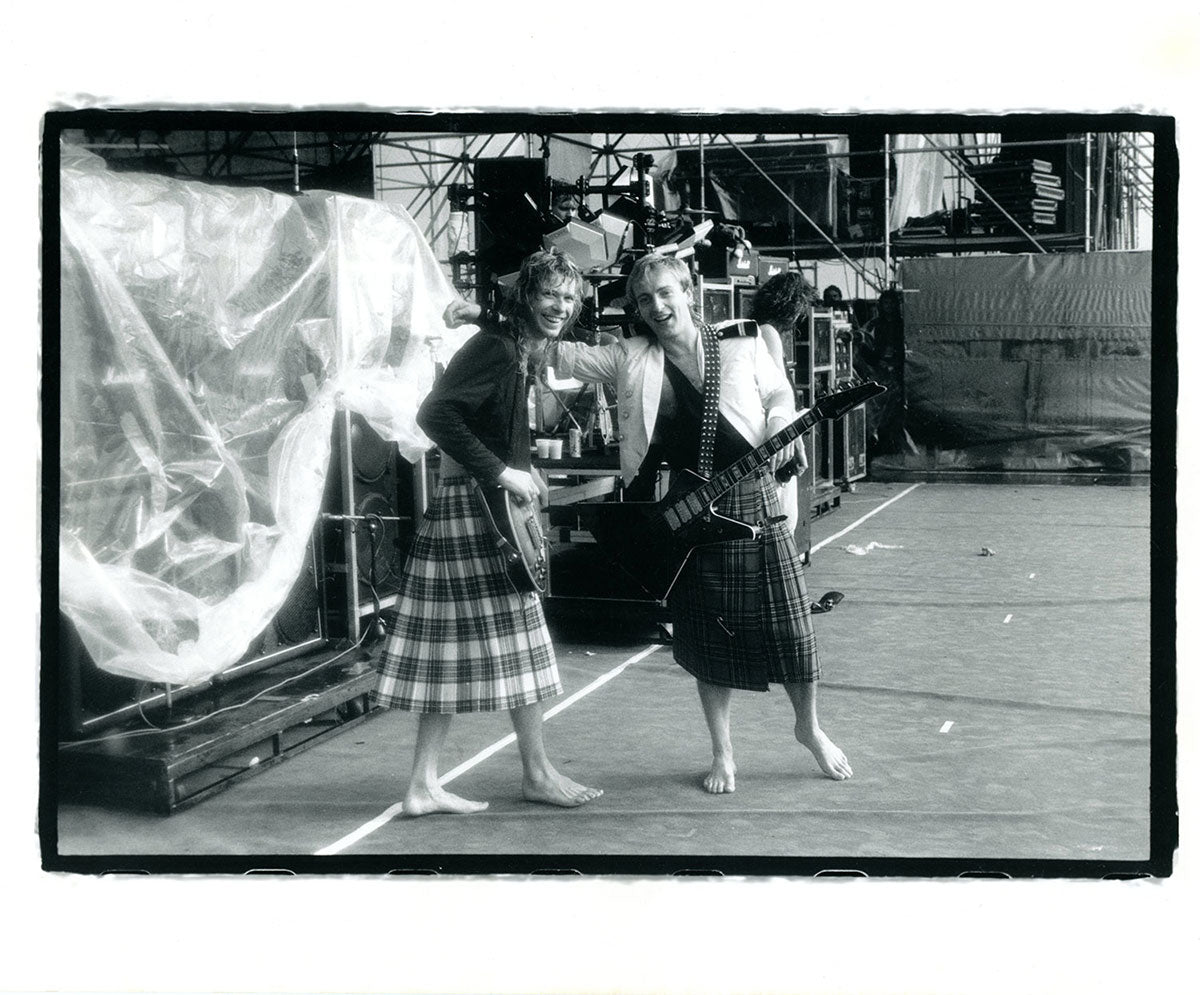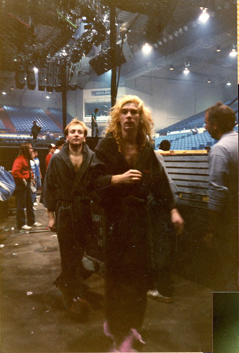 A rare shot of Steve Clark and Phil Collen post-Hysteria performance, as they emerged from under the stage once the audience had cleared the building. Phil recalls: "Obviously by the bewildered look on our face, we have no clue where we are. No, that's after one of the in-the-round shows on the Hysteria tour. Because we would have to go under the stage, and wait for the audience to leave. So you'd be covered in sweat. Sometimes we'd do a three-hour show, or a two and a half-hour show. You'd be dripping, and it got chilly in some of these [venues]. AC and all of that. So we would sit underneath and have to wait for the arena to file out. So we had these big furry slippers - moose slippers and these really thick robes, these fluffy robes that would keep us warm, and then we'd sneak out. We'd just walk out like that. And we would get to the stage by getting in laundry hampers. Me and Sav used to share a laundry hamper, and Steve and Joe used to share the other one. Rick used to go out disguised. He'd have a fake arm and, and a baseball cap, and he'd go out earlier. So he could play along to the opening act. So yeah. And then afterwards, we'd all sit there and, and dress up like this." Color photo print from the Arco Arena in Sacramento, CA. Courtesy of the Lorelei Shellist Private Collection.