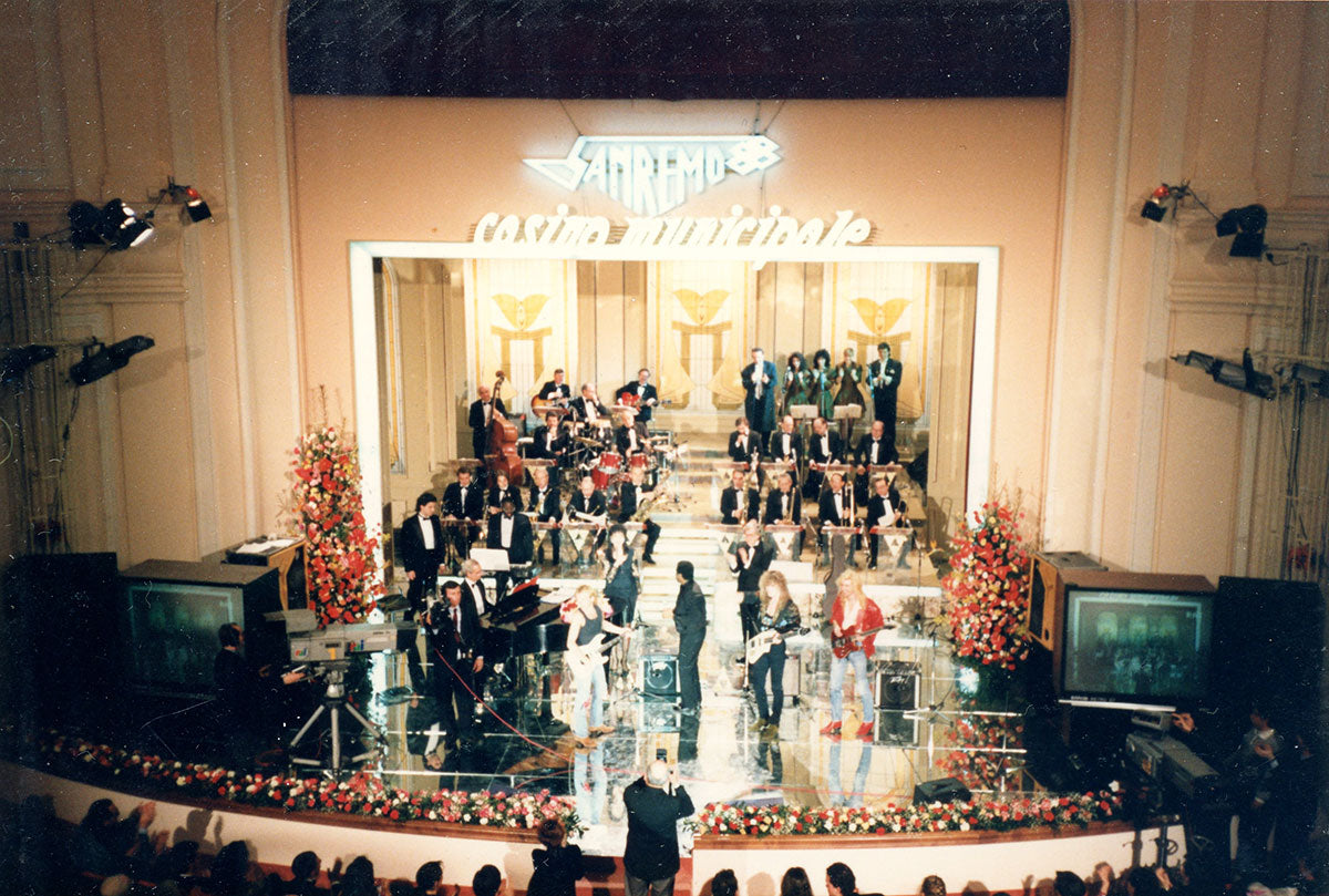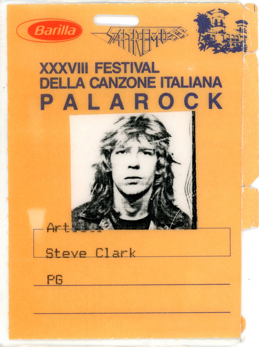 Buonosera, Sanremo! Steve Clark's laminate all-access pass for the Sanremo Music Festival, 24-27 February 1988 at the Teatro Ariston di Sanremo. During the festival, Phil Collen, Rick Savage, and Steve Clark were special guests for the incredible Ben E. King's as they performed his classic "Stand By Me." The laminate includes a nice black and white passport-style picture of a serious Steve, ready to give Italy a taste. Courtesy of the Lorelei Shellist Private Collection.