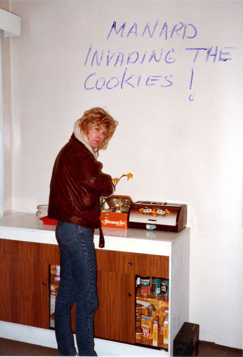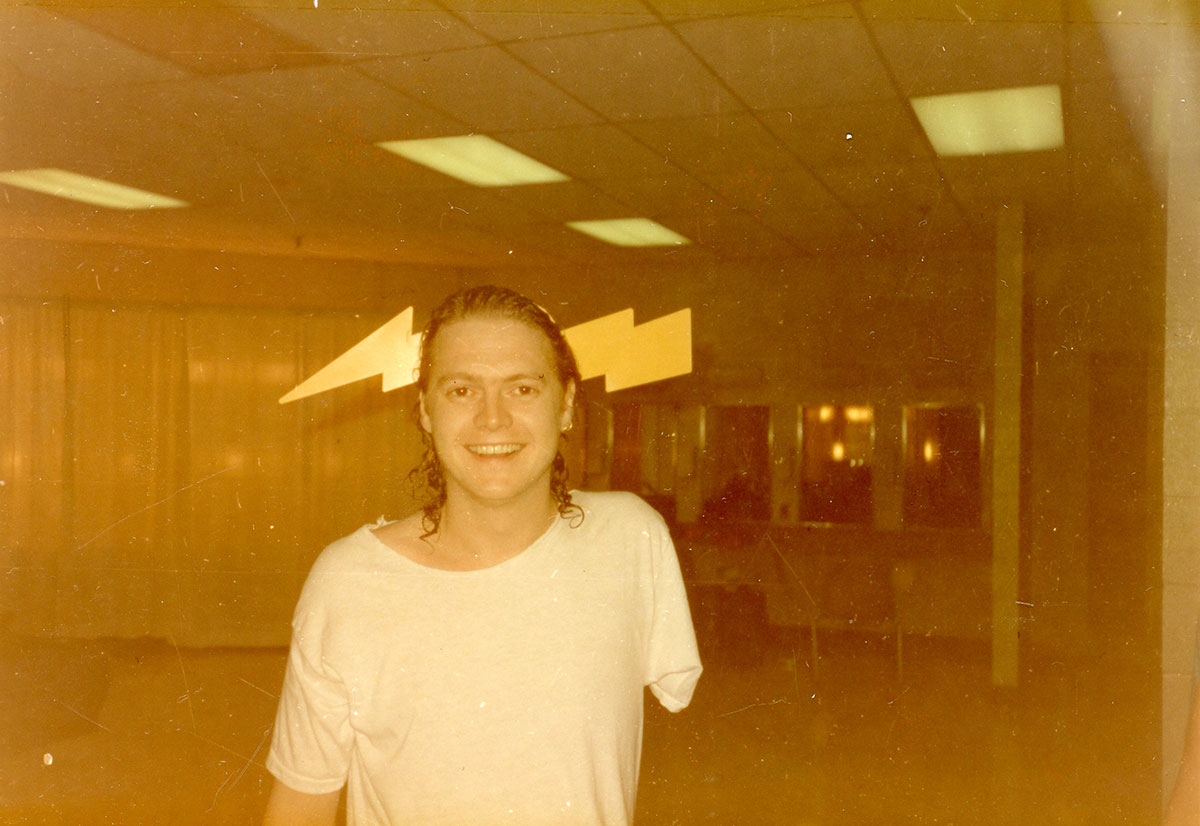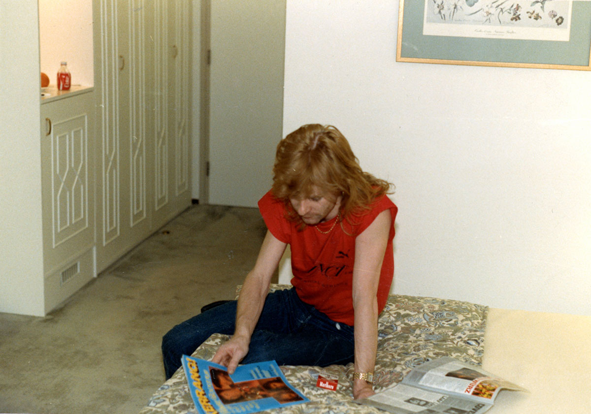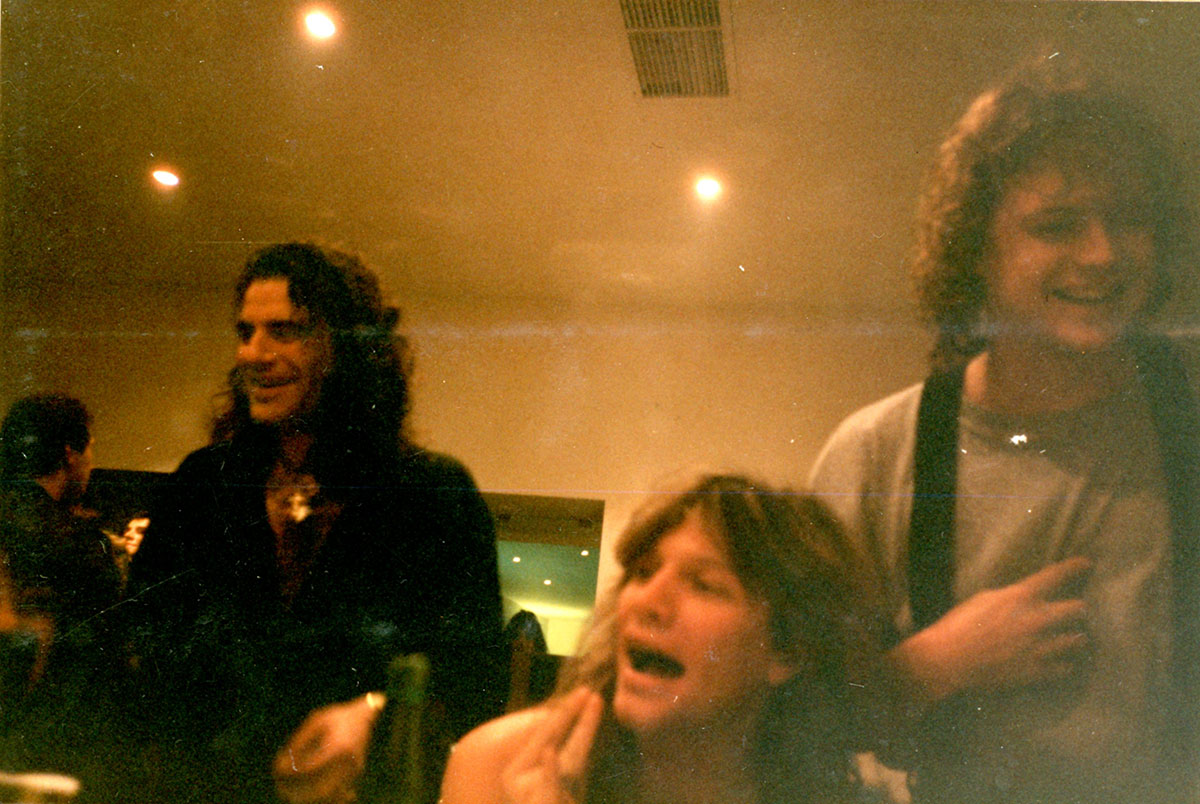 It's Booterstown Band House cocktail hour for Rick Allen, circa 1984 in Dublin. Steve Clark searches through tapes, bending down just behind him. The band had a studio in the back of the house for writing and rehearsing Hysteria. Courtesy of the Lorelei Shellist Private Collection.