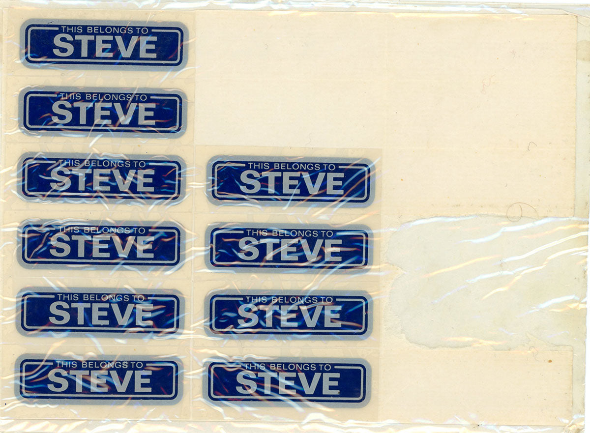 Ten of Steve Clark's "This Belongs To Steve" labels left on a sheet of 18. Not certain the date they were used, likely the mid to late 1980s, but am fairly certain more than 8 items belonged to Steve. Courtesy of the Lorelei Shellist Private Collection.