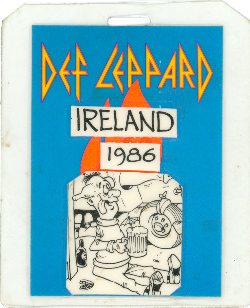 All-access pass! This 1986 laminate from the Ireland Hysteria tour features a comic by an unknown artist with a flare for expressing comic inebriation. Def Leppard played six shows in Ireland for this tour, from Cork through to Dublin. The band's time recording and playing in Ireland particularly struck Joe Elliott - "I loved Ireland. I loved it so much I ended up moving there. I fell in love with the place the second I landed on that particular Emerald Isle, and never looked back." Courtesy of the Lorelei Shellist Private Collection.