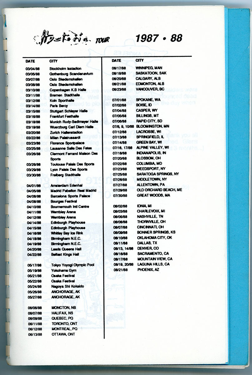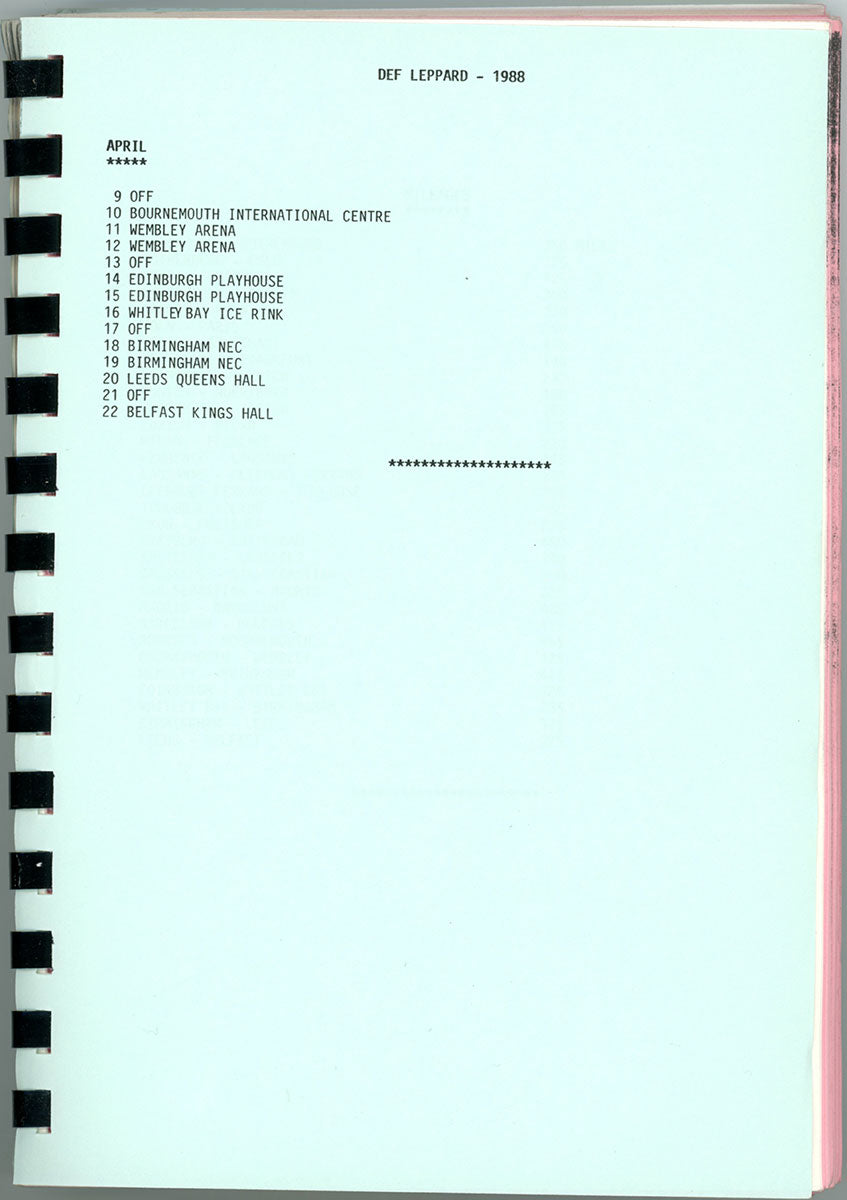 Amazing. Steve Clark's personal Hysteria Tour Itinerary Book for the kick-off dates of an epic, world-hopping, year-long adventure, beginning with that very first warm up show in Dublin S.F.X Hall, 27 August,1987. This spiral-bound booklet contains details for all of the Ireland/England leg of the tour, including dates, venues, sound check and performance times, travel routes, hotels, and days off. It also offers a little gem of advice, as surely the team was nervous, not knowing how the tour would be received. "Don't worry over what other people are thinking about you, they are too busy worrying about what you are thinking about them!" Words to live by. Courtesy of the Lorelei Shellist Private Collection.