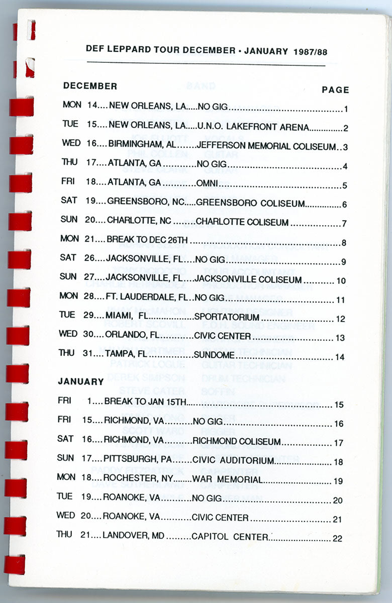 Amazing. Steve Clark's personal Tour Book for the December 1987 and January 1988 dates of the epic, world-hopping, year-long adventure that was the Hysteria tour (now nicknamed "Panic in the Round.") This spiral-bound booklet contains details for the leg of the tour covering dates in Europe and the UK. You'll find dates, venues, sound check and performance times, travel routes, hotels, and days off - everything the band needed to know to get to the gig on time. Handwritten notes from Steve Clark and Lorelei Shellist inside with contacts and flight info. A detailed look at a thrilling time in Def Leppard history. Courtesy of the Lorelei Shellist Private Collection.