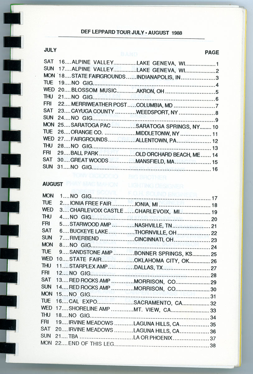 Steve Clark's personal copy of the Hysteria World Tour Itinerary Book for the US/Canada leg, 1988. This spiral bound itinerary includes tour dates/locations, personnel roster, and a triumphant congratulatory letter from one known as "Fearless Leader." Steve undoubtedly thumbed through these pages time and again, looking over the stops that had been, and the stops yet to come. Reading the itinerary gives a peek at the inner-workings of this wild, in-the-round, nowhere-to-go-but-under-the-stage mega-tour that was Hysteria. Can you feel it? Do you believe it? Courtesy of the Lorelei Shellist Private Collection.