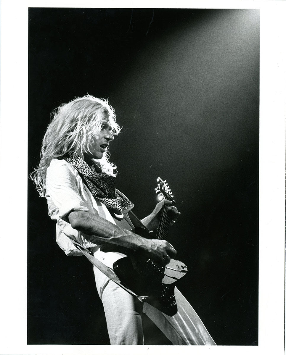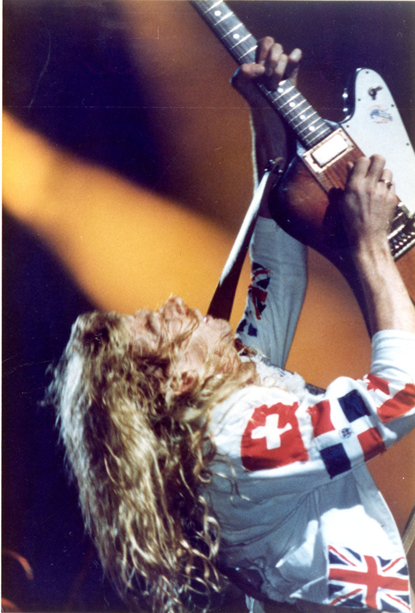Steve Clark's Gibson Firebird is about to take flight in this live shot taken at Vancouver's Pacific Coliseum, 23 June, 1988, Hysteria Tour. Special guest Bon Jovi would appear for the encore that night. Steve's jacket (made by Lorelei Shellist) features international flags, with the Swiss, Dominican Republic, and Canadian flags on the right arm, and the Union Jack on the pocket. Photo print is in good condition. Courtesy of the Lorelei Shellist Private Collection.