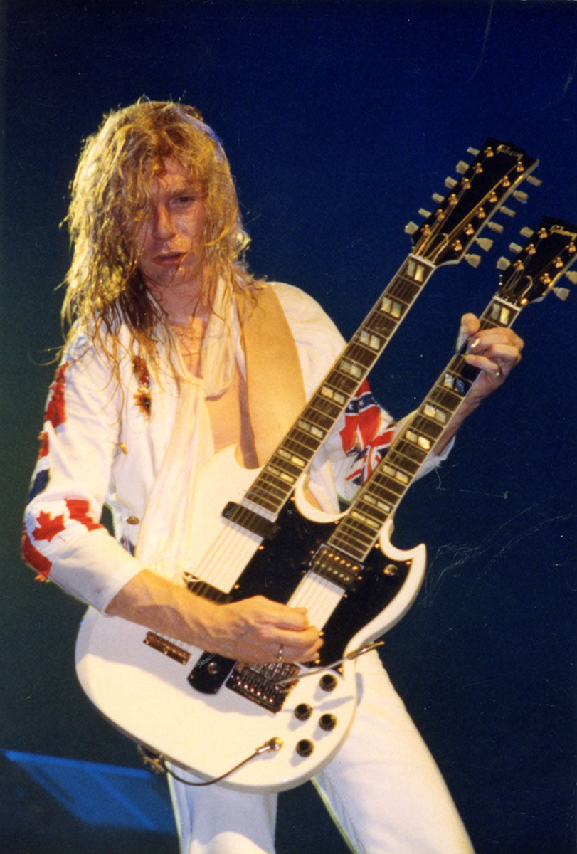 A blazing moment captured - Phil Collen rocking back-to-back with Steve Clark at the Pacific Coliseum in Vancouver, 23rd June 1988. It was the final night of the Hysteria tour Canada, and Jon Bon Jovi appeared as the special guest for the encore song "Travelin' Band." Steve is playing "the coolest guitar in rock" - the Gibson EDS-1275 Twin Neck, made famous by Jimmy Page. Who needs the Gods of War when you've got two Gods of Rock? Courtesy of the Lorelei Shellist Private Collection.
