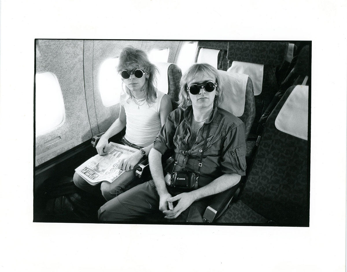 Steve Clark and Phil Collen together on a plane during the Pyromania tour, somewhere in Europe. Phil gives a little background to these particular sunglasses, and his iconic military surplus look of this tour. 8x10 black and white photo print. Courtesy of the Lorelei Shellist Private Collection.