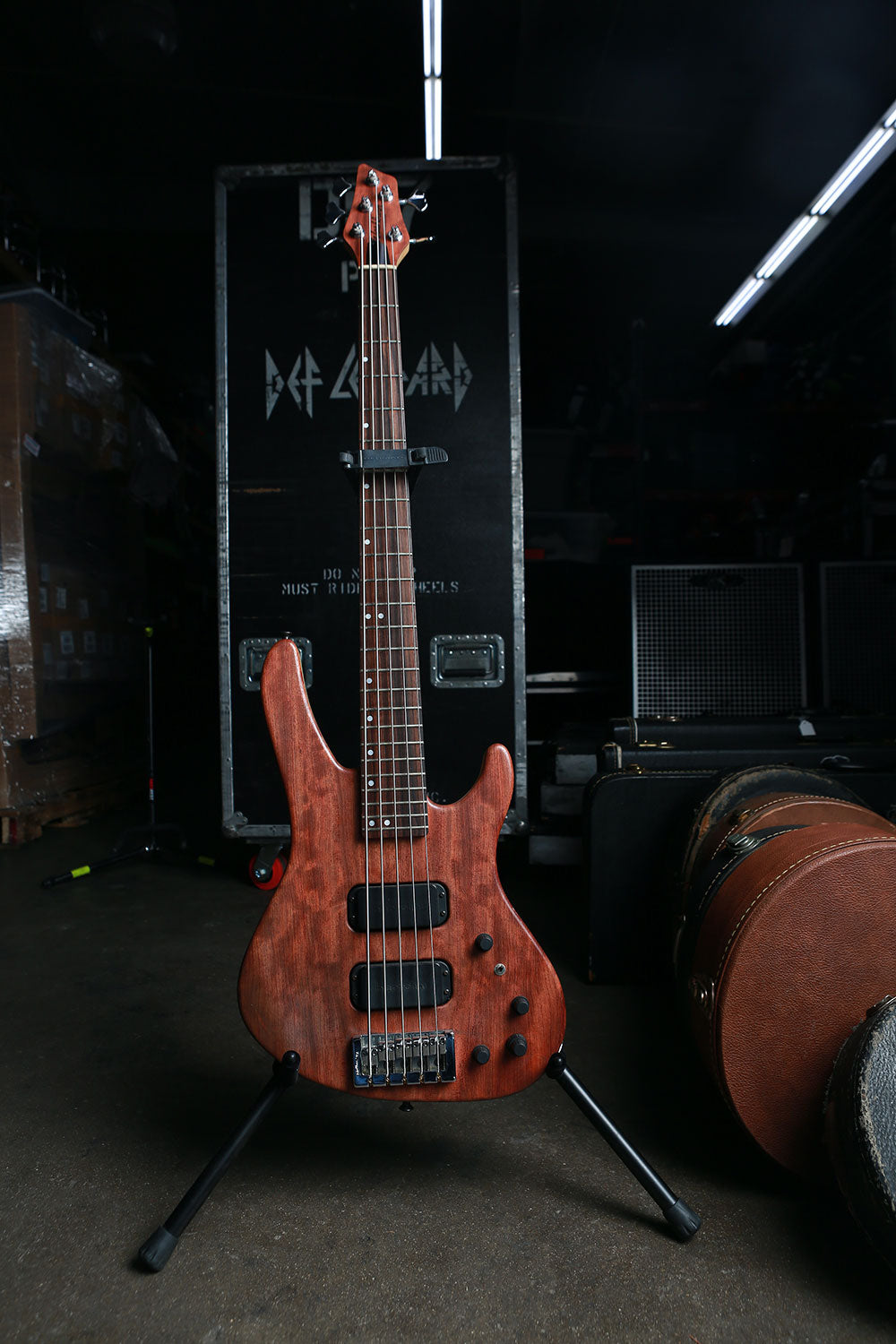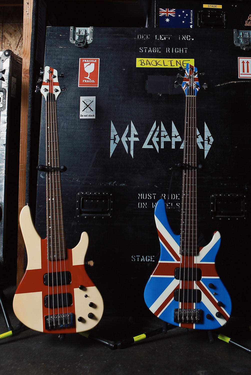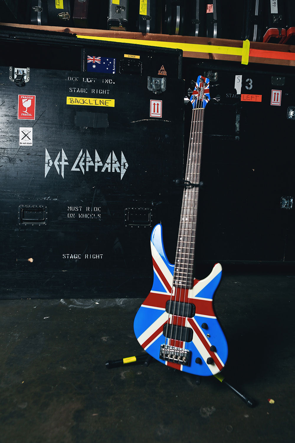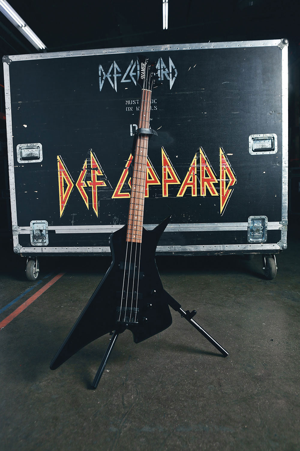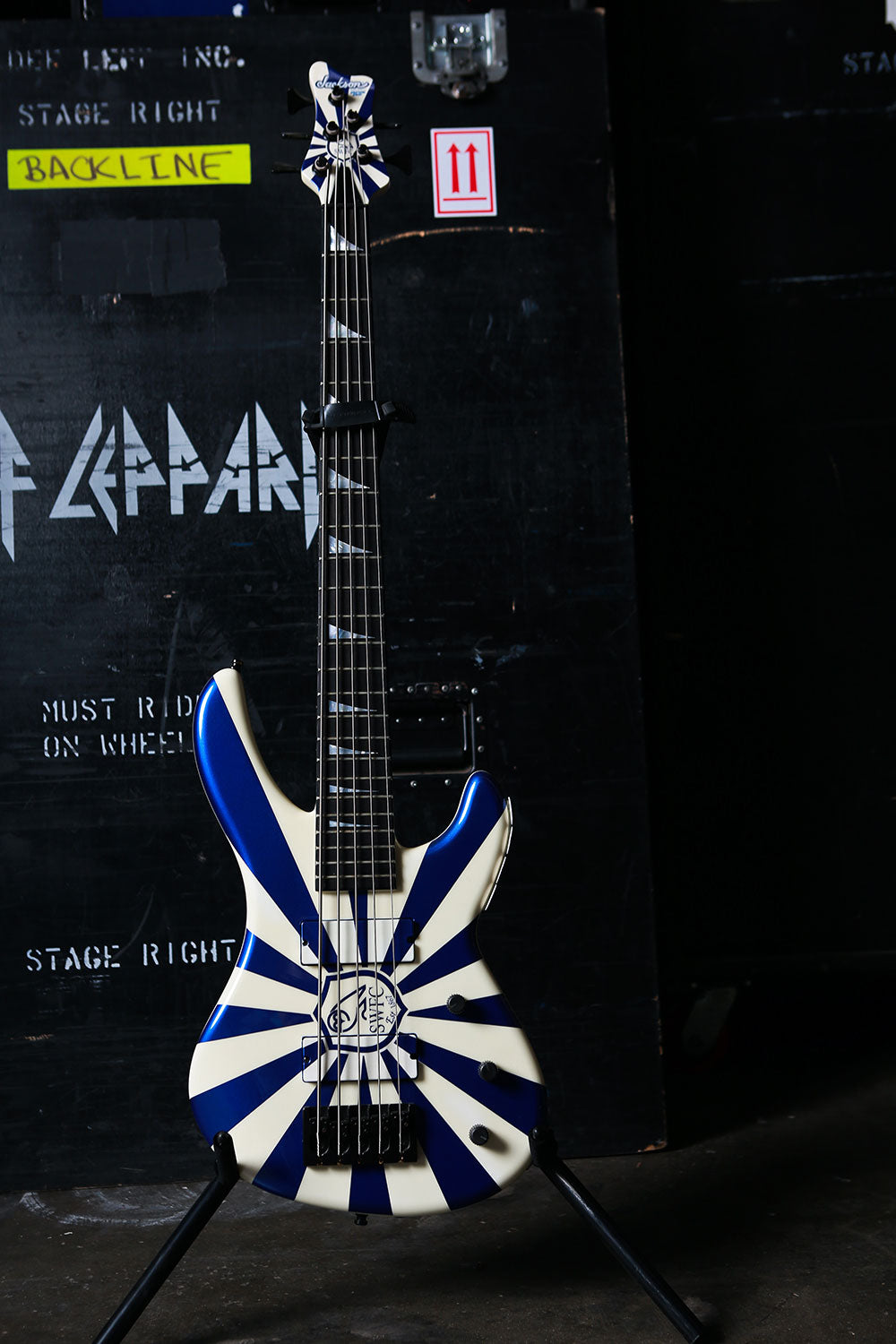Rick Savage tunes up before another mind-bending Hysteria Tour performance in this rare behind-the-scenes sound check snap. The band really got their steps in at these shows, playing upstairs, downstairs, at all different angles, ensuring that everyone was delivered mad rock 'n roll all around. Rick Allen reminisces about the experience of riding those Hysteria risers up into the air with Sav: "It was pretty unique you know, having four front rows. The scariest part of the show for me was the whole riser during the middle section of Rocket would start to go up into the air. Probably up to about you know, probably about 30 feet above the deck. You know, Sav was standing behind me, looking out. And I'm standing or sitting you know, looking into my kit. So I'm looking one way, he's looking the other. And as the, as the riser went higher and higher and higher, Sav would start to push into me. So it was like at certain times, it got really quite challenging to play, because he was, he was obviously a little afraid of heights, you know? And like I say as we got, as we got further up in the air, he would push further in. And I didn't want to push back on him because you know, I mean it, it would have been disaster, disastrous if he had fallen off." 4x6 color print. Courtesy of the Lorelei Shellist Private Collection.