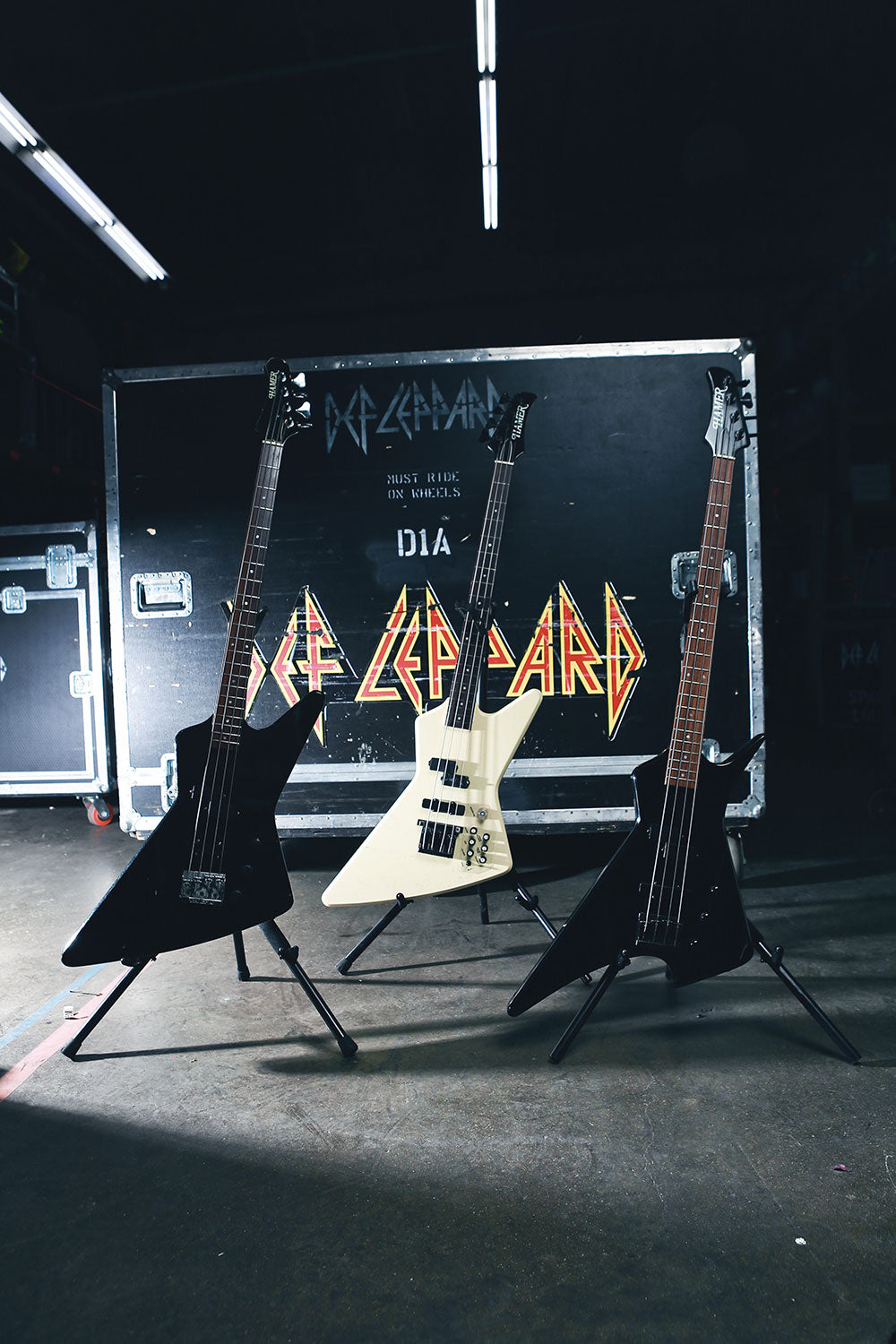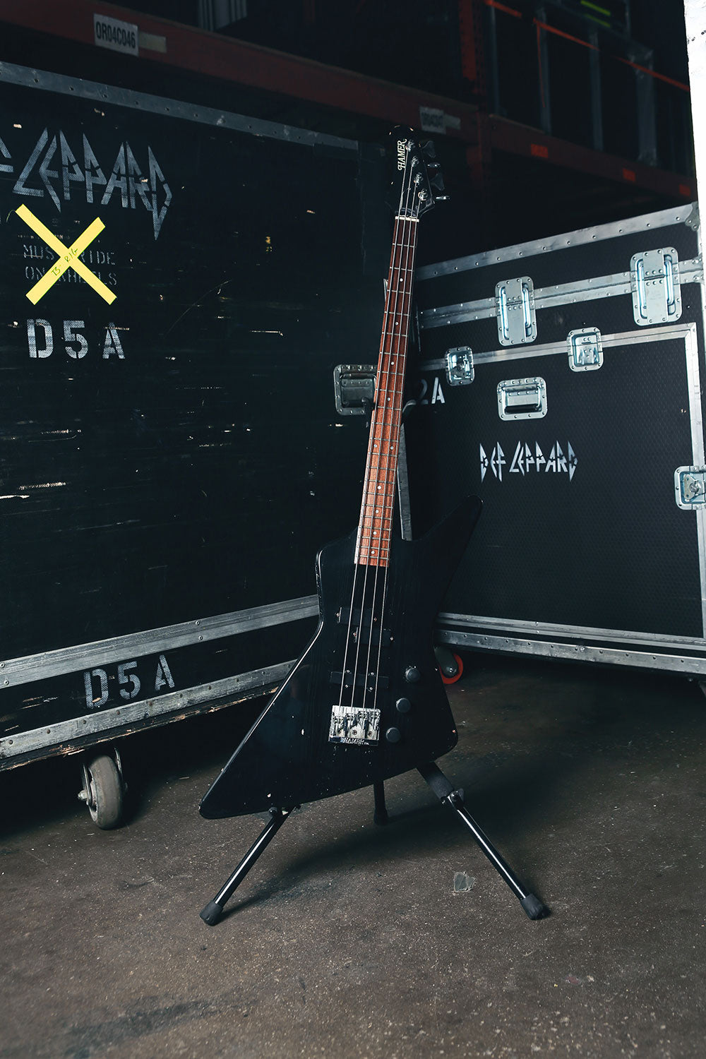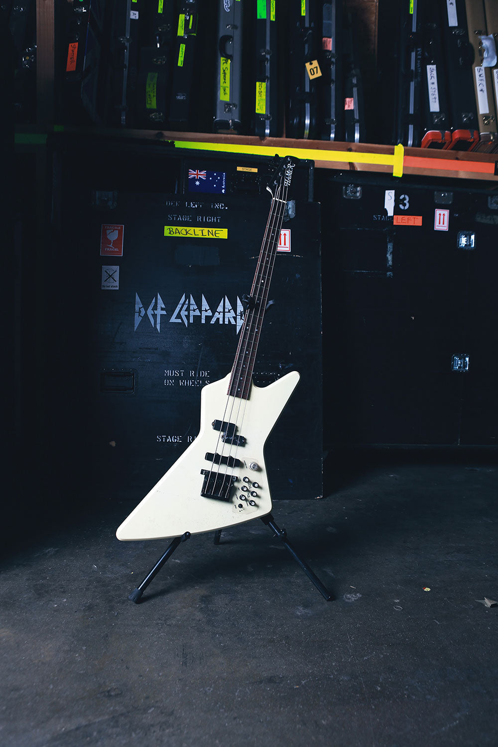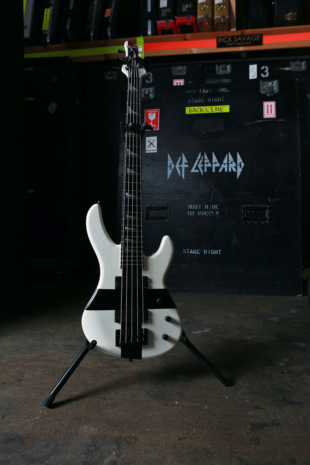 Sav was known for his uniquely styled bass guitars since the Pyromania days as music videos became popular. His main bass then was a white Hamer Scarab, that he still has at home.