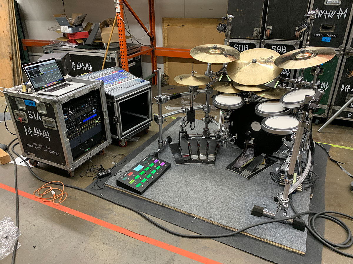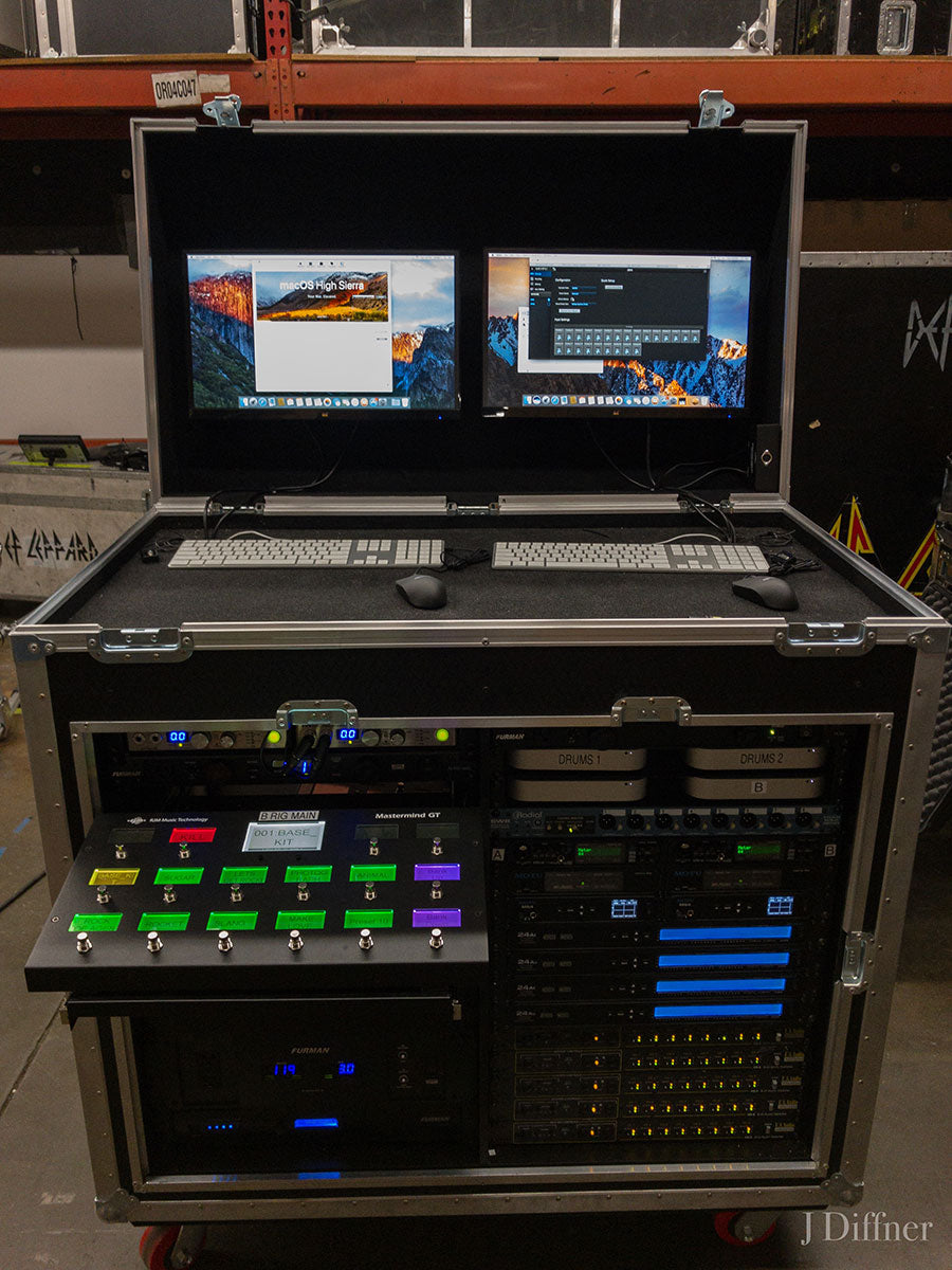 The “brains of the operation” as some might say. This is the computer rack from Rick’s A-rig kit. After the 2015 world tour, it became apparent that Rick’s older HART Dynamics system was in dire need of an upgrade. Part of a complete overhaul, Rick moved his electronics to a newer software system from Digital Elements and Apple computes with Motu interfaces. Built with redundancy and expandability in mind, Rick’s rig now has the capability of handling 24 individual trigger inputs and 56 outputs, all switchable between multiple computers. In a first for Def Leppard world, Rick’s click also moved from a classic Alesis SR18 to a more modern. and consistent, computer system. This has also given the rest of the touring production access to time code to more accurately sync video content and special effects such as lasers to the live performances.
