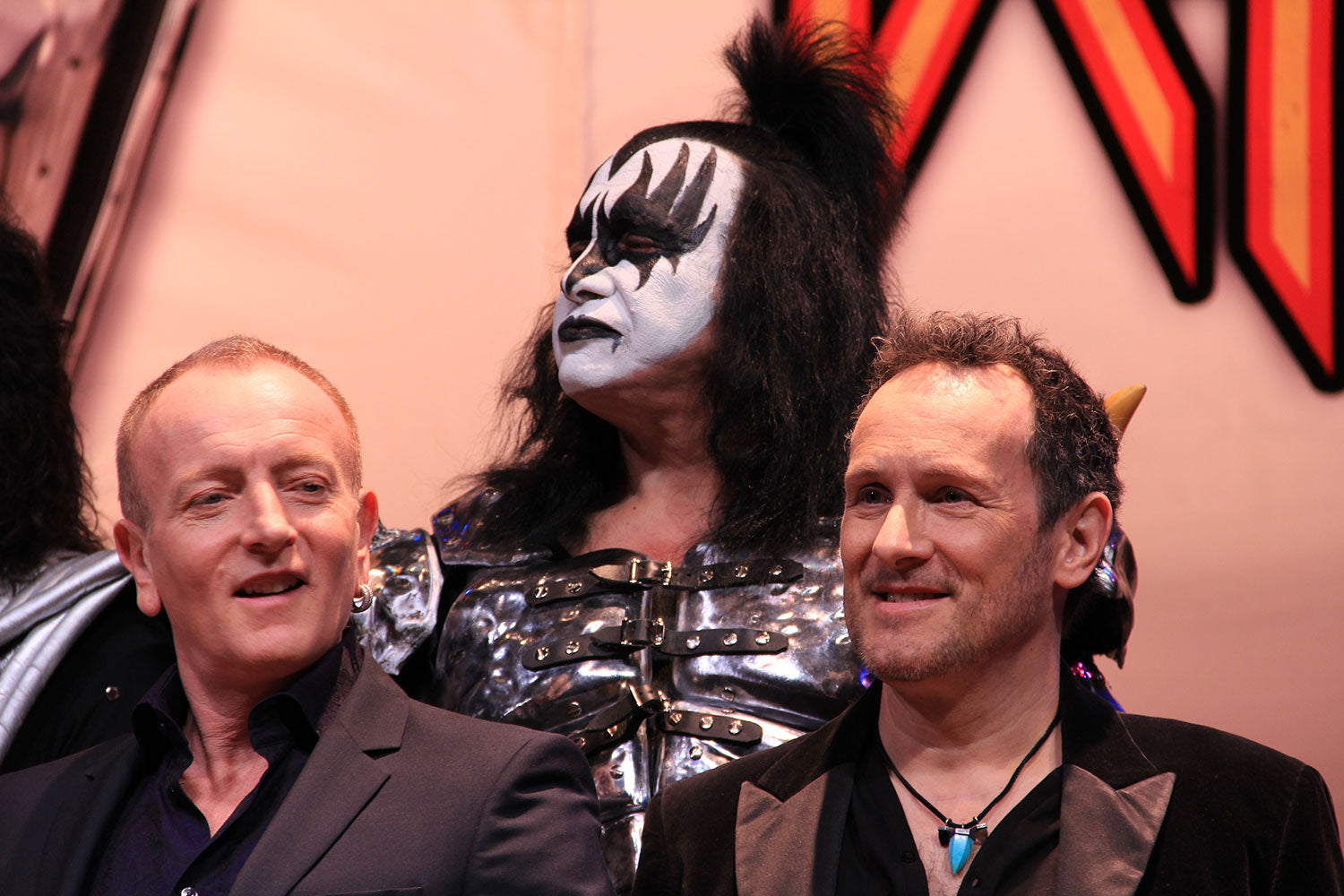 KISS and Def Leppard pose for a photo shoot after a livestreamed press junket and Q&A produced by Live Nation, March 2014. This event was in preparation for the KISS 40th Anniversary World Tour, which Def Leppard joined them on for the first 42 shows. Here we get a close-up and personal look at the Demon Gene Simmons looming over Phil Collen and Vivian Campbell. From the collection of Phil Collen.