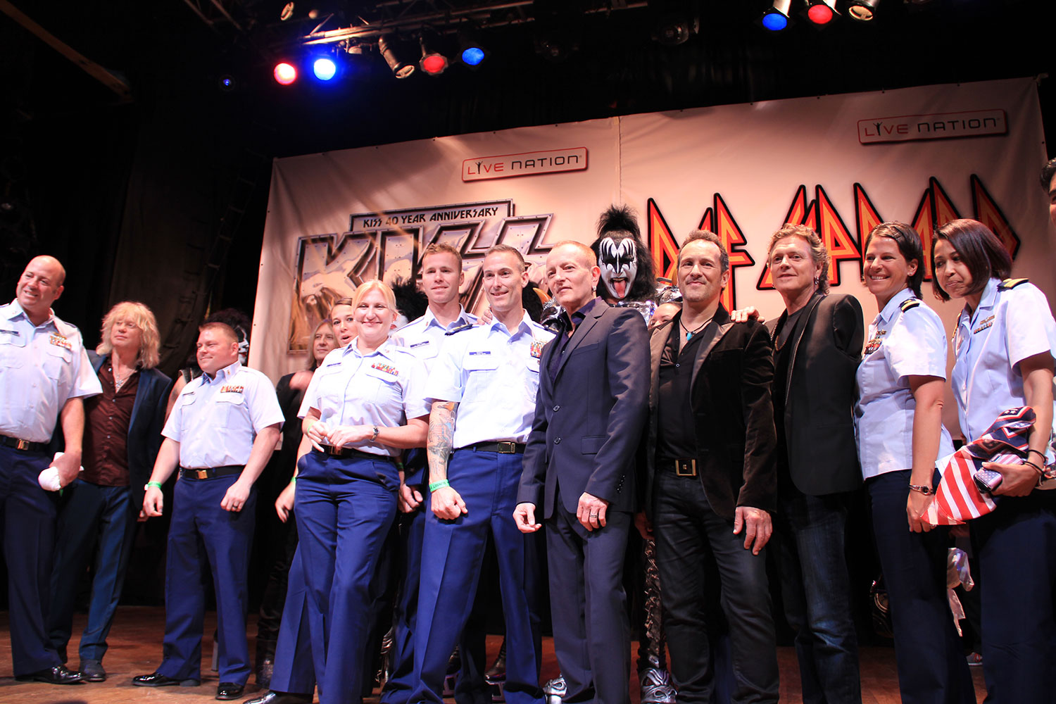 KISS and Def Leppard pose for a photo shoot with USO fans after a livestreamed press junket and Q&A produced by Live Nation, March 2014. This event was in preparation for the KISS 40th Anniversary World Tour, which Def Leppard joined them on for the first 42 shows. From the collection of Phil Collen.