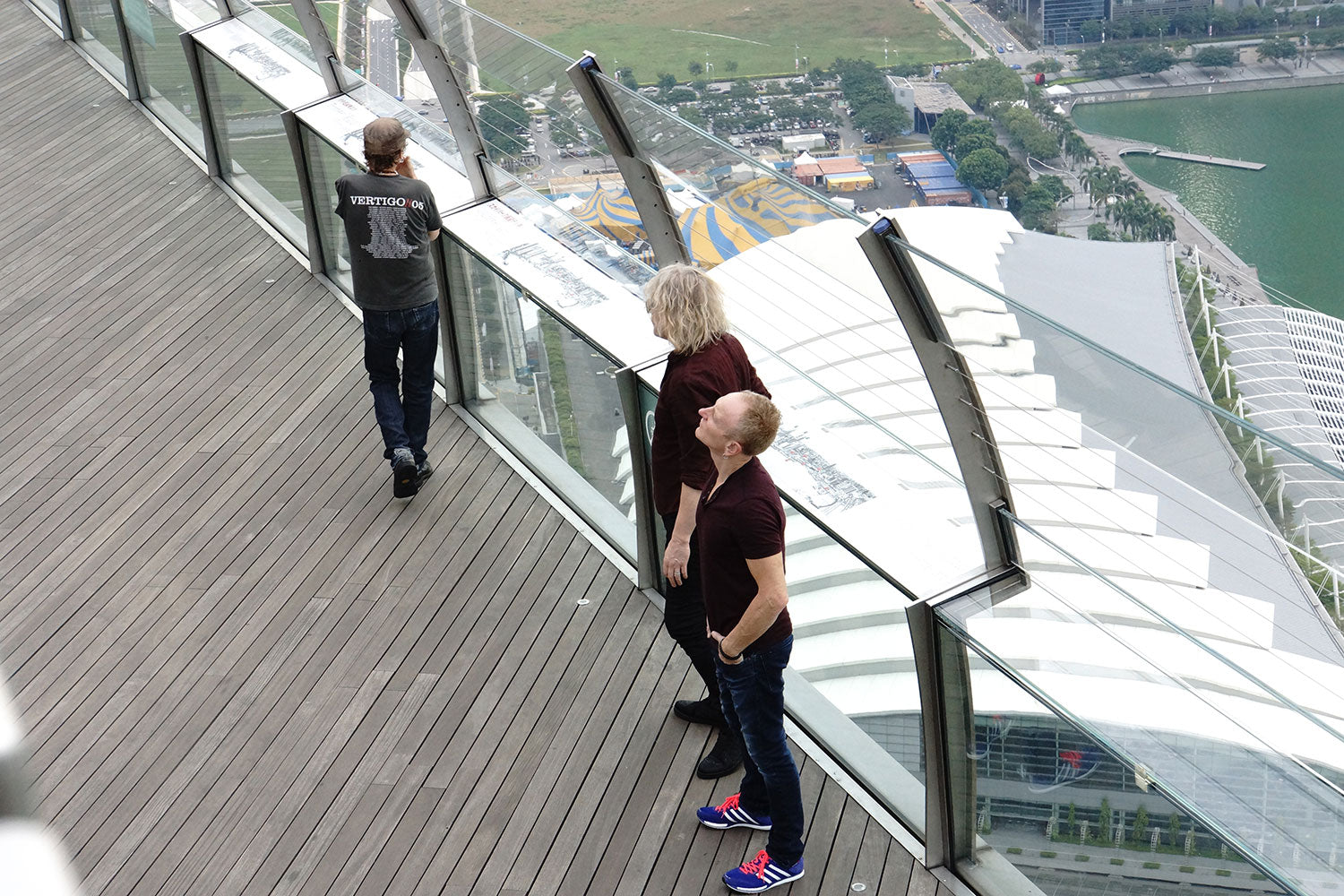 Rick Allen, Joe Elliott and Phil Collen wander the observation area overlooking beautiful Singapore before the band's performance at the Suntec Singapore Convention and Exhibition Centre, November 2015. From the collection of Phil Collen.