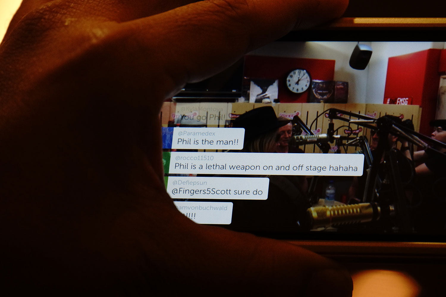 "Phil is the man!!" True words captured on this screen shot from a fan's phone during this press interview for the Def Leppard Tour at 91.3 FM Radio in Singapore, November 2015. From the collection of Phil Collen.