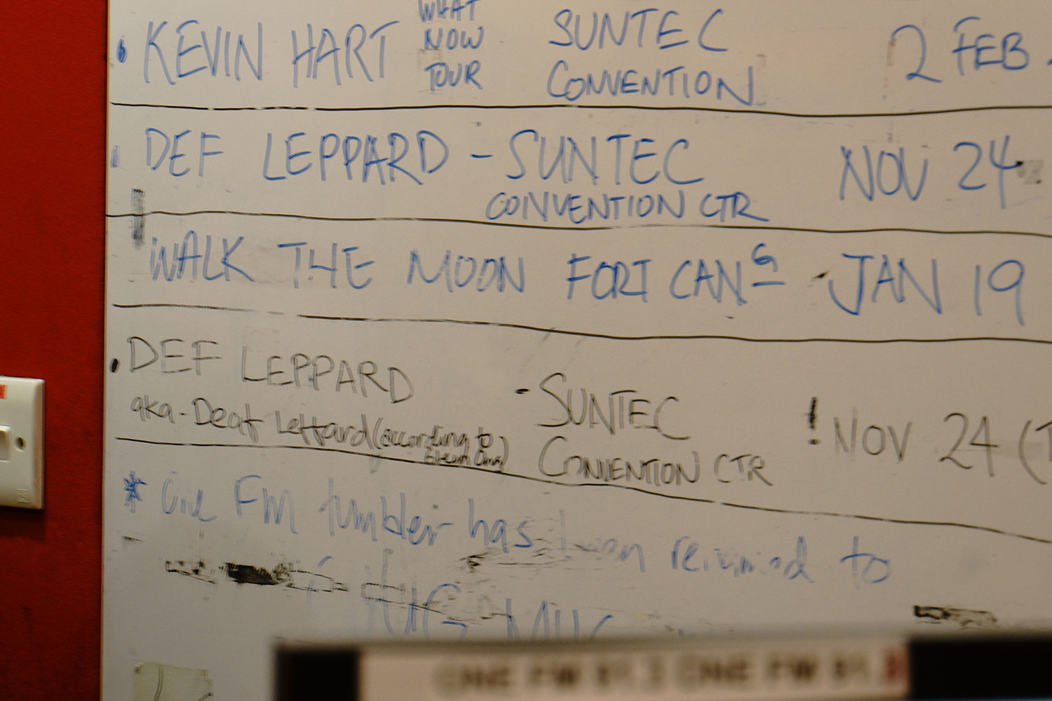 In November of 2015 Joe Elliott, Phil Collen, and Vivian Campbell visited 91.3 FM Radio in support of the band's stop at the Suntec Singapore Convention and Exhibition Centre. The station's whiteboard lists Def Leppard as well as other upcmoing acts. From the collection of Phil Collen.