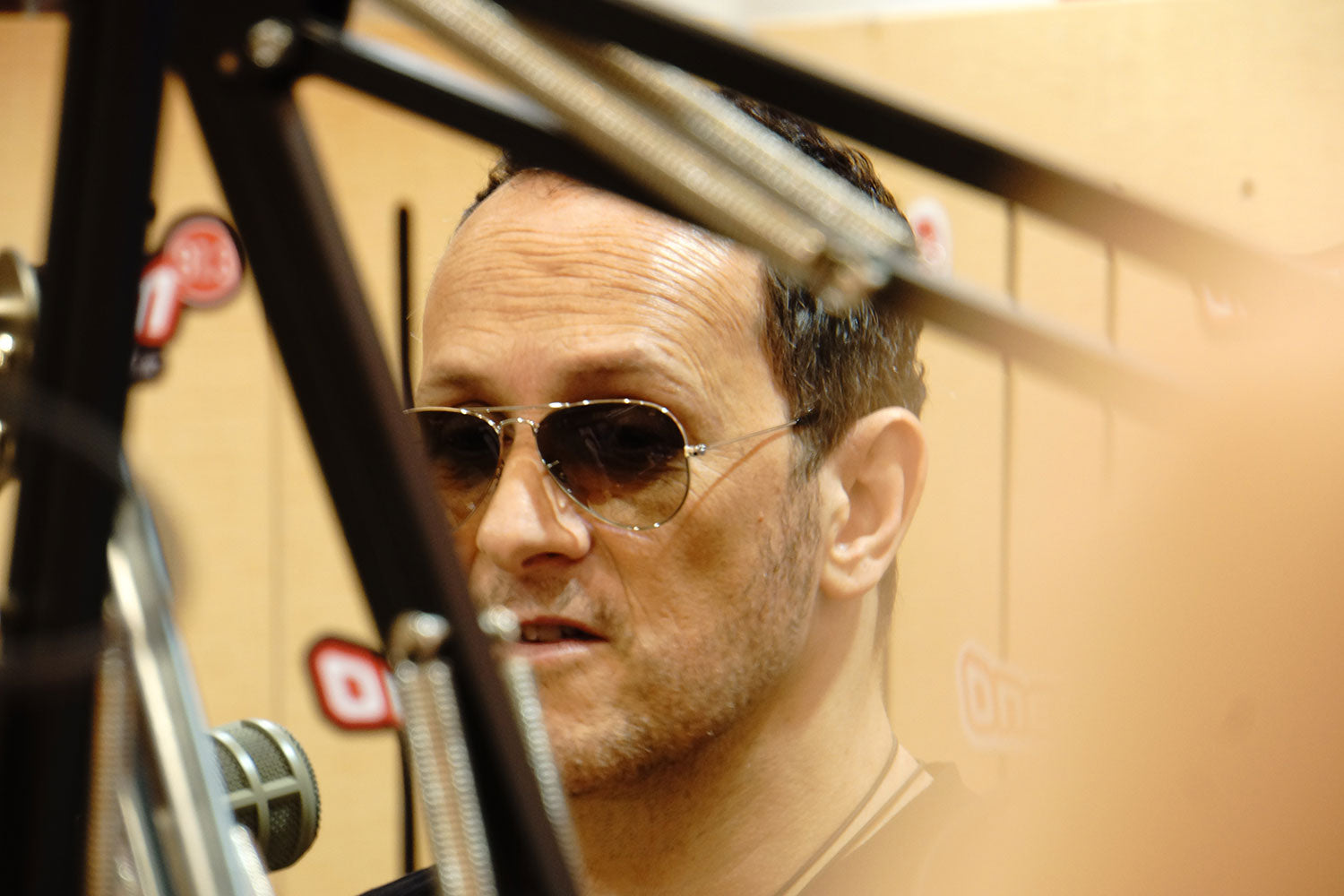 In November of 2015 Joe Elliott, Phil Collen, and Vivian Campbell visited 91.3 FM Radio in support of the band's stop at the Suntec Singapore Convention and Exhibition Centre. Here we get a nice close up of Vivian Campbell's turn at the mic. From the collection of Phil Collen.