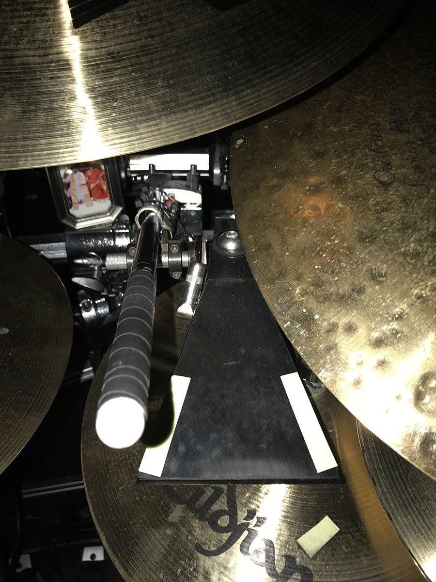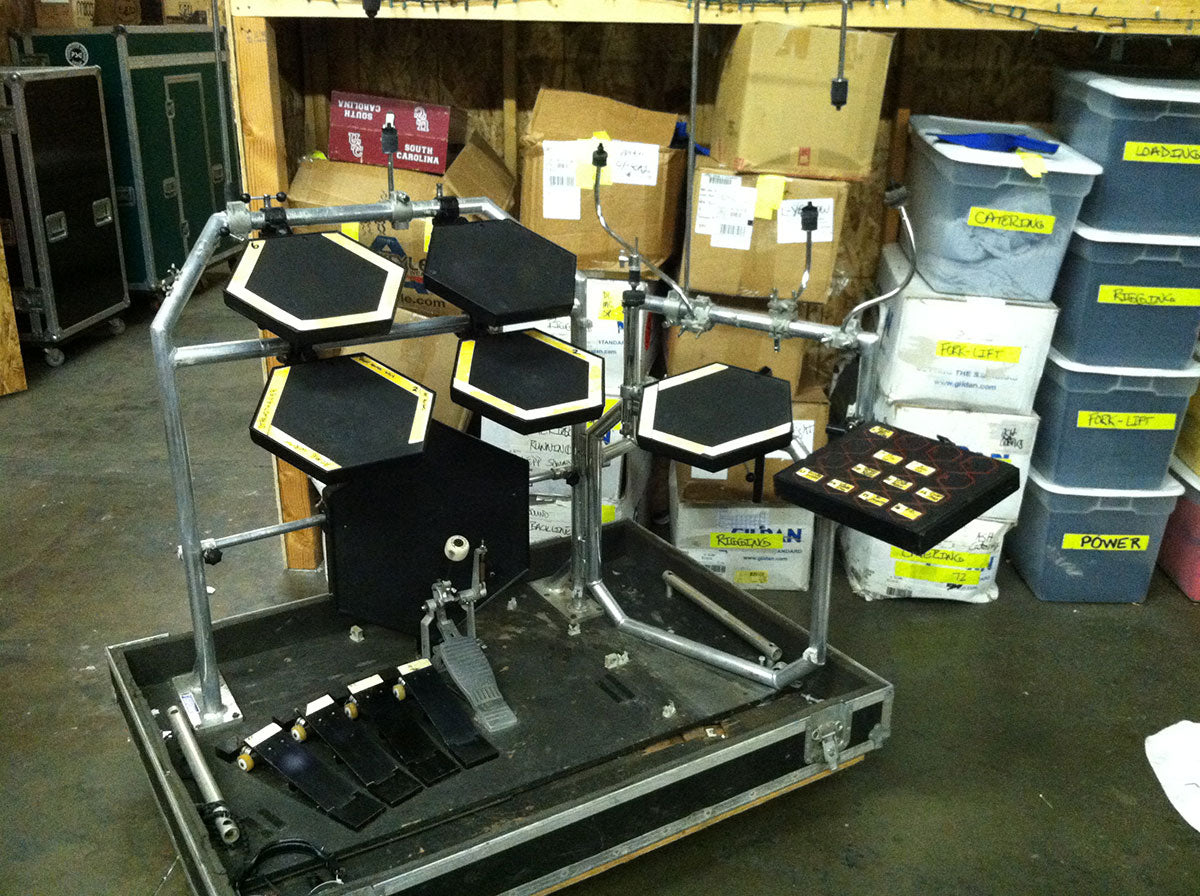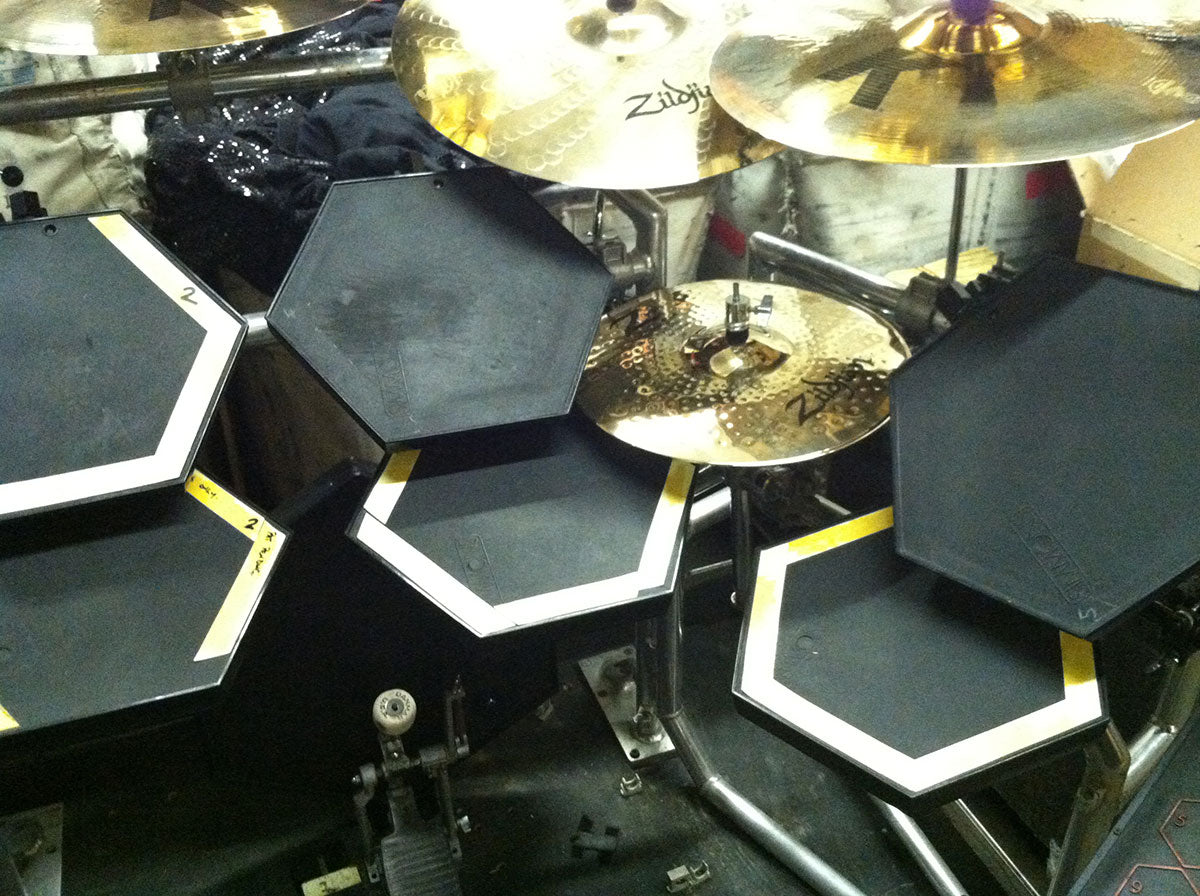 Rick will often place small pieces of glow tape on the edges of certain hats and triggers. As it can get very dark between songs, he doesn’t want to accidentally smack the wrong one before the lights come up!