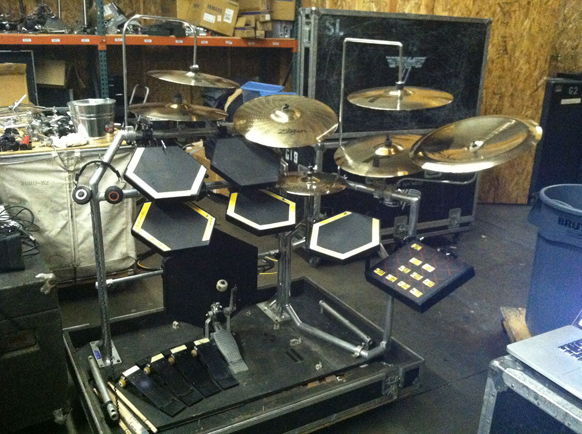 Starting in 2013 Rick began to move away from the HART Dynamics drum pads that he used and began using the Pintech pads. Pads on the right are custom made shells from Yamaha with Pintech electronics. While very similar to the HART pads in design, the Pintechs were a little more sensitive.