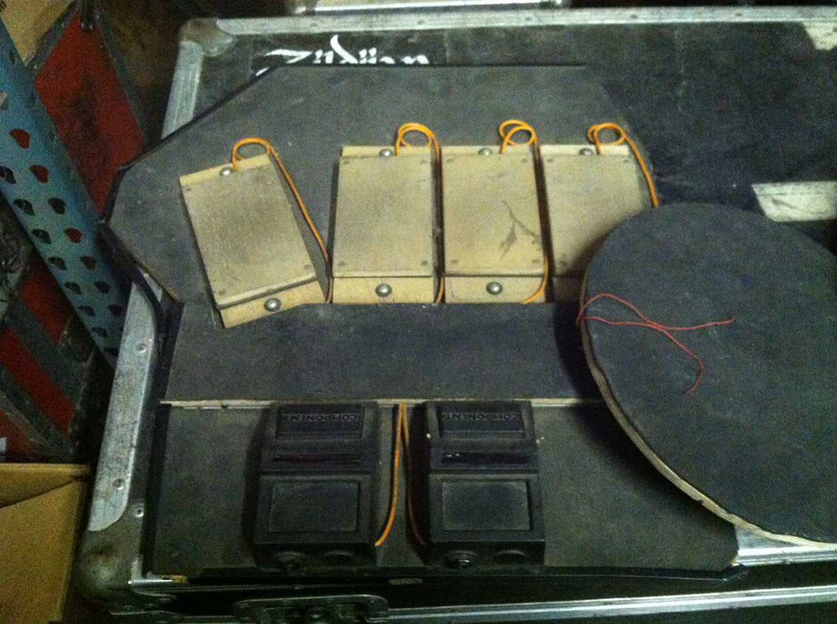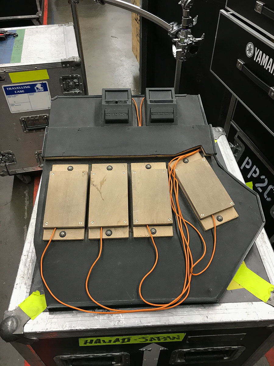 Some of the earliest foot pedals Rick used were the Shark pedals. The pedals were spring loaded but didn’t offer a lot of finesse. The trigger in the middle is a customized piece, notable for it’s use of from instead of a spring. Rick found that with springs you would often get a lot of bounce out of the pedal which could result in a “double trigger” or extra drum hits.
