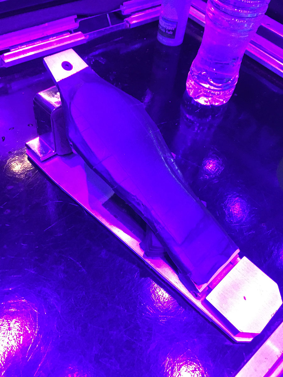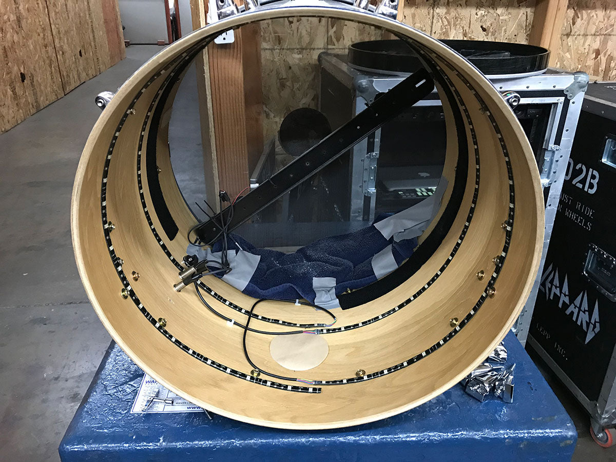 The inside of one of Rick’s kicks showing the LED lighting and Pintech trigger system. The LED are controlled by the band’s Lighting Director and the backlit kick drum heads can often be seen changing color over the course of the night