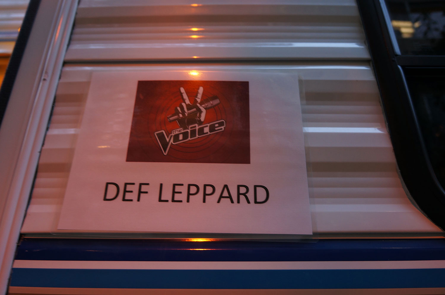 On the 17th of December 2013, Phil Collen, Vivian Campbell, and Rick Allen were the special guests on The Voice, where they performed "Pour Some Sugar on Me" with Christina Aguilera, Blake Shelton, Adam Levine, and Cee Lo Green. The boys were given a swanky Star Waggon trailer with their name on it and everything in which to relax. From the collection of Phil Collen.