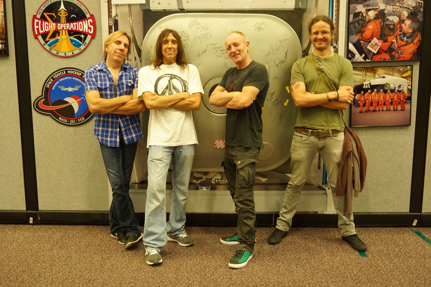 Phil stands in front of the freshly-signed NASA wall of fame with Tesla's Jeff Keith and Troy Luccketta. The boys took a guided tour of the Johnson Space Center in Houston, Texas, on the 22nd of August 2016 before playing at the Cynthia Woods Mitchell Pavillion that night. From the collection of Phil Collen.