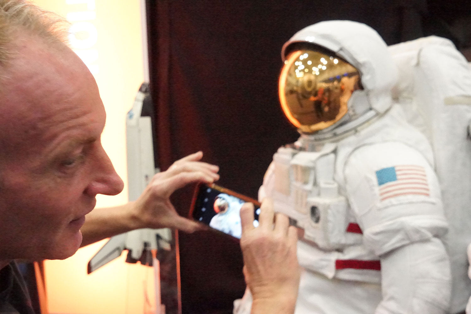 Phil Collen takes a quick pic of an American spacesuit during his visit to NASA's Johnson Space Center in Houston, Texas, 22nd August, 2016. Take a look at the suit's visor to see Phil's reflection, creating an infinity picture loop. From the collection of Phil Collen.