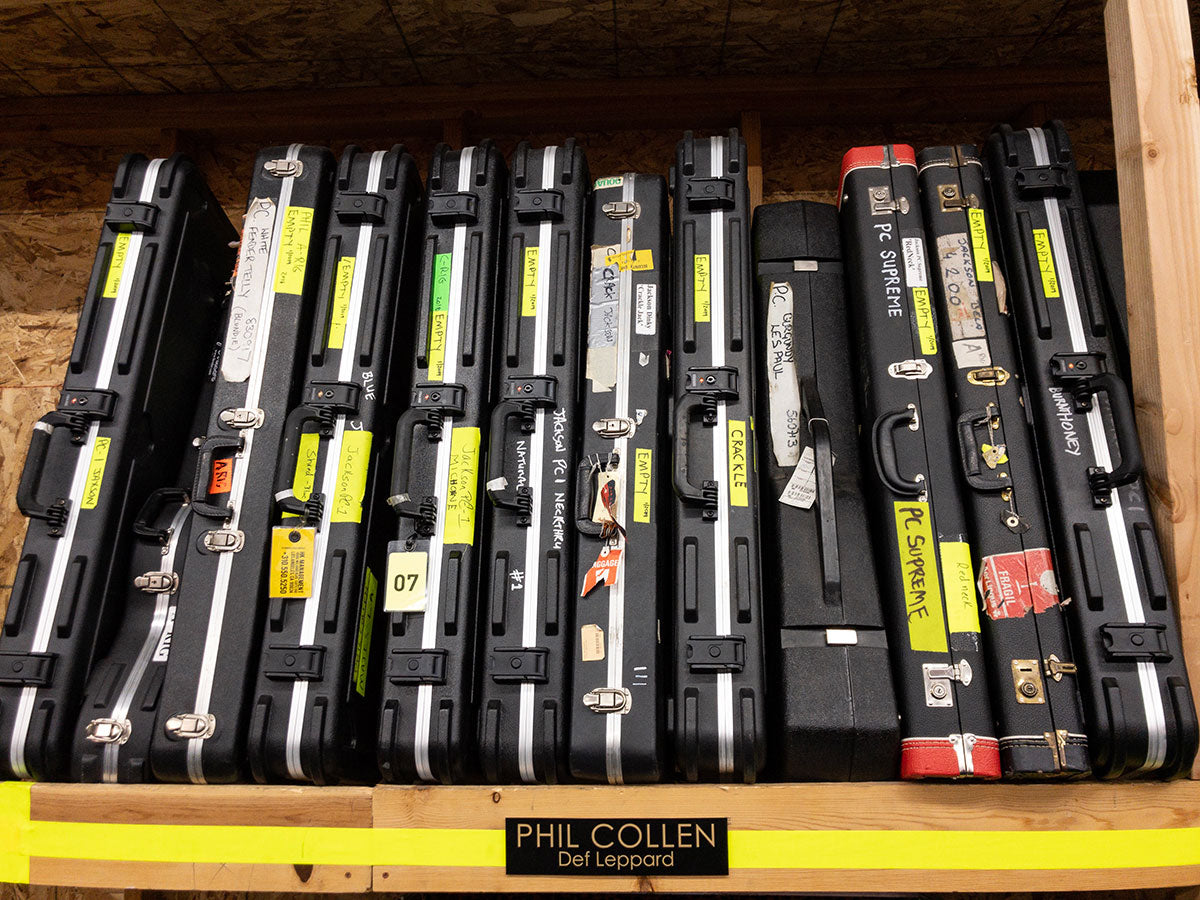 Some of Phil's guitar cases in storage.