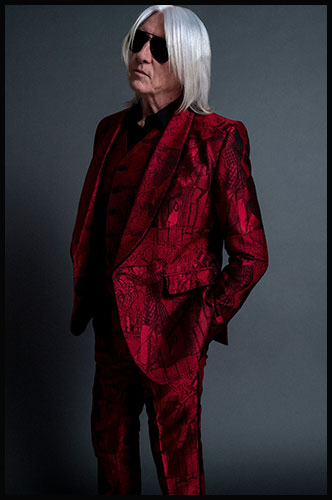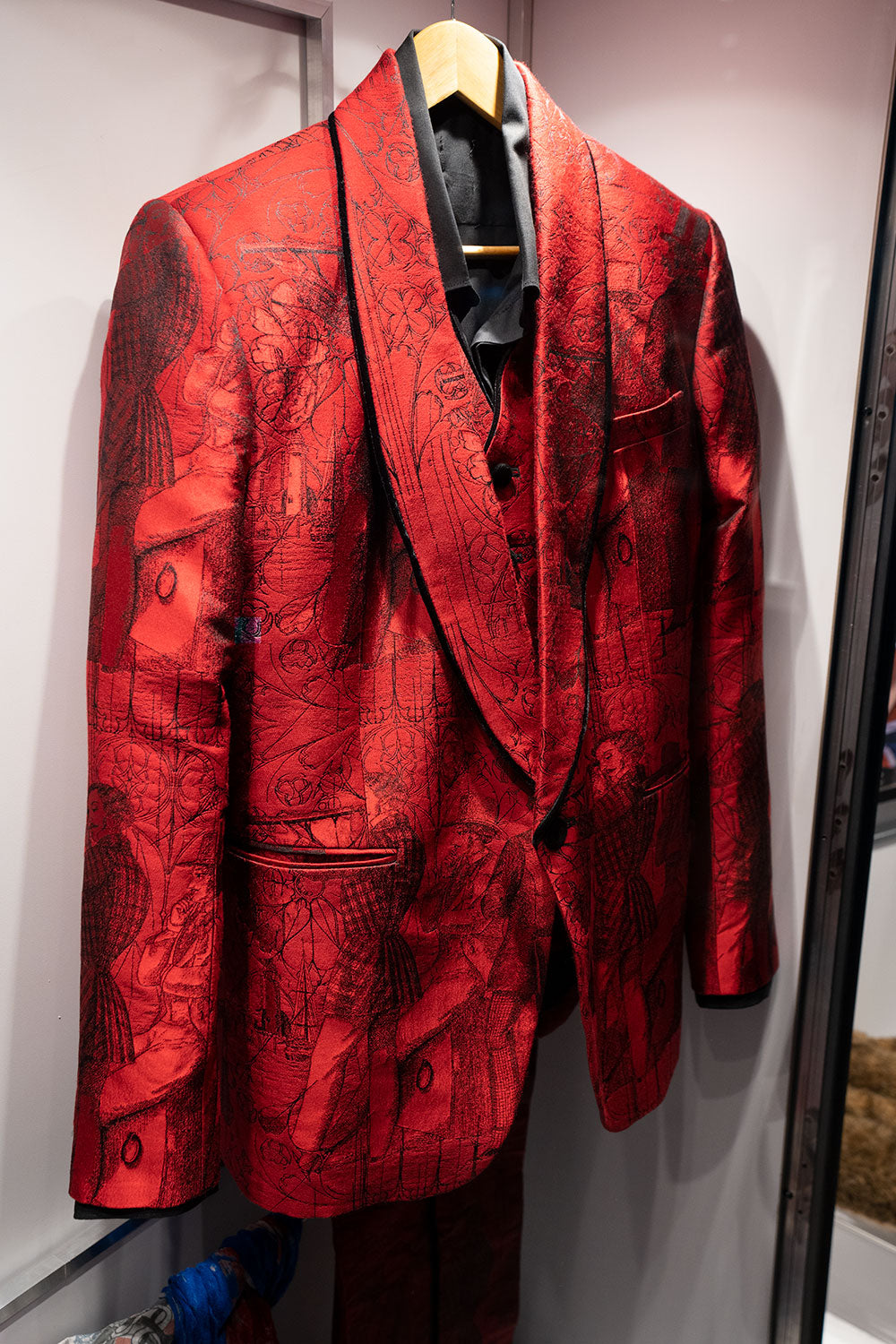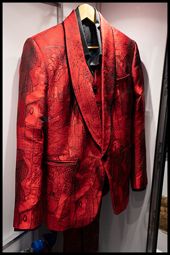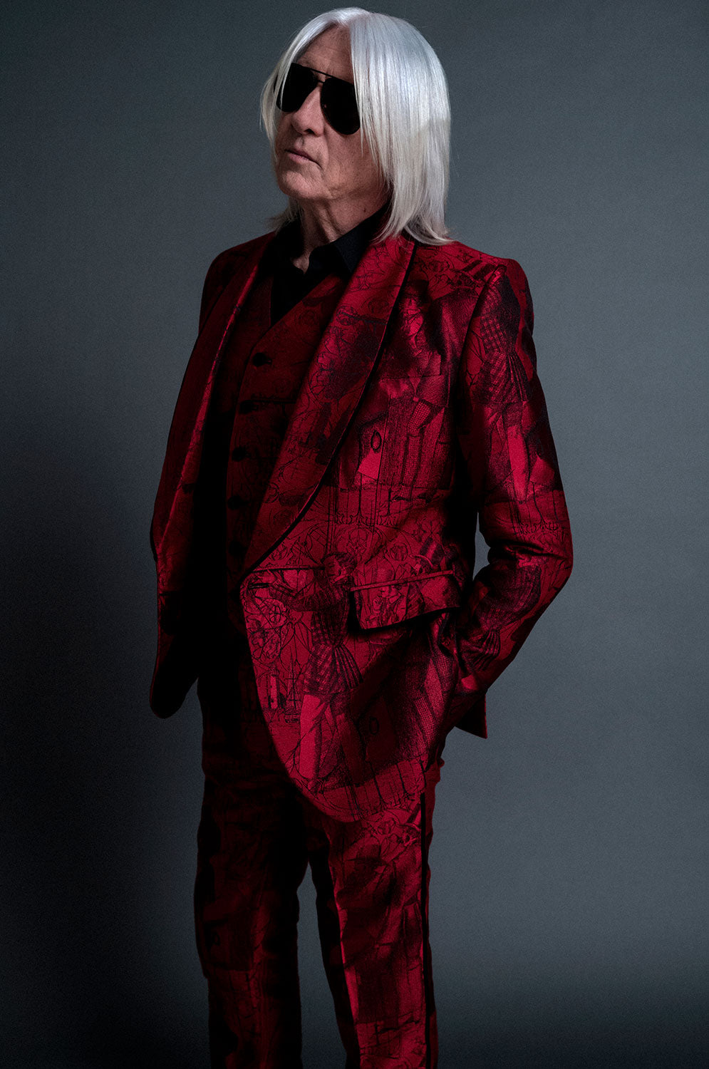 Joe's red crimson silk suit with Edwardian fabric design, as seen in his most recent portrait by Anton Corbijn. The suit was made in England with bespoke tailoring by Joshua Kane. The fabric and prints are handmade. From the Collection of Joe Elliott.