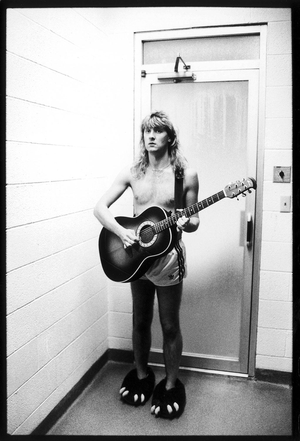 Joe wears bear slippers in a backstage area on the Hysteria Tour, circa 1987. From the Collection of Def Leppard.