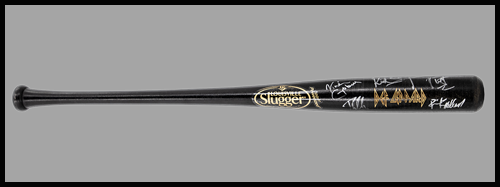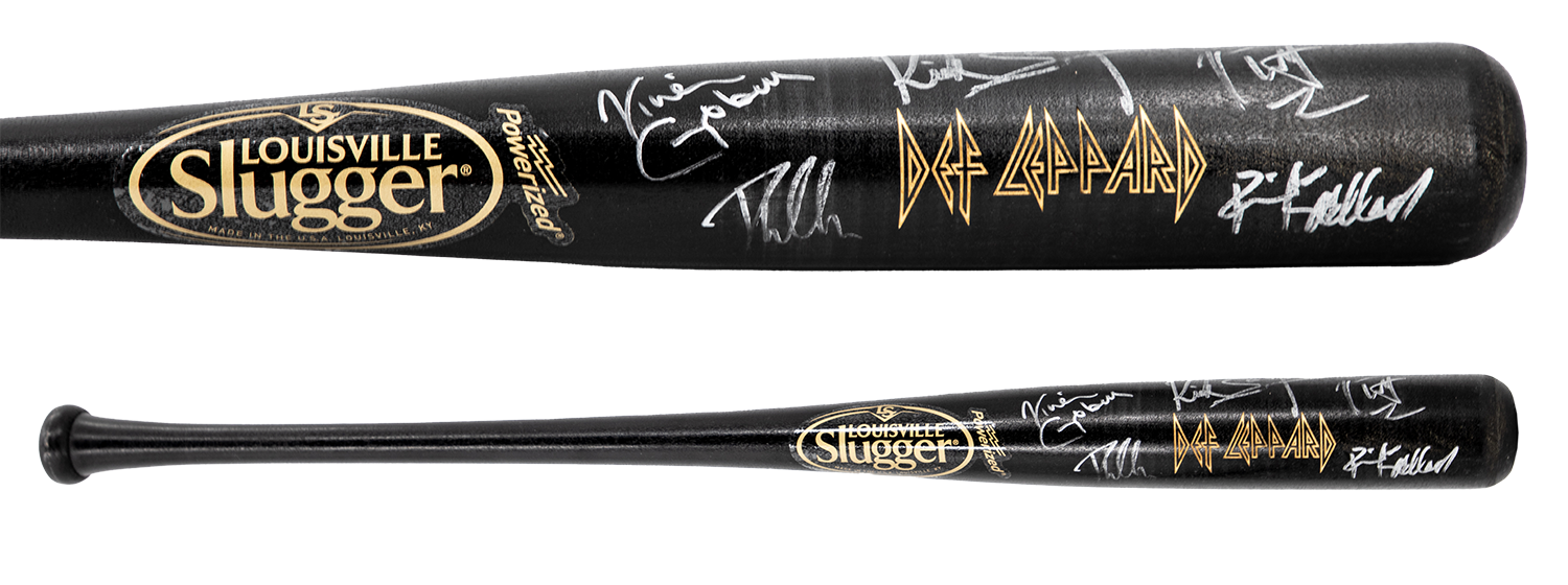 Bat signed by Joe, Phil, Sav, Rick, and Viv as part of the Louisville Slugger Museum & Factory heavy metal collection. From the Collection of Def Leppard.