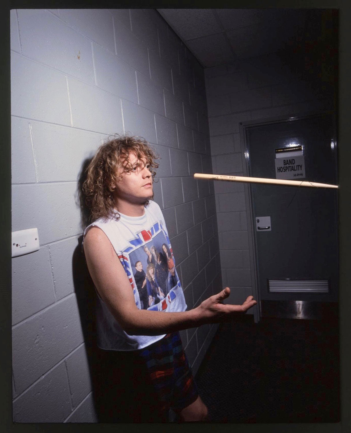 Rick waits just outside of the band hospitality room on the Adrenalize "Seven Day Weekend" Tour, 1992. From the Collection of Def Leppard.