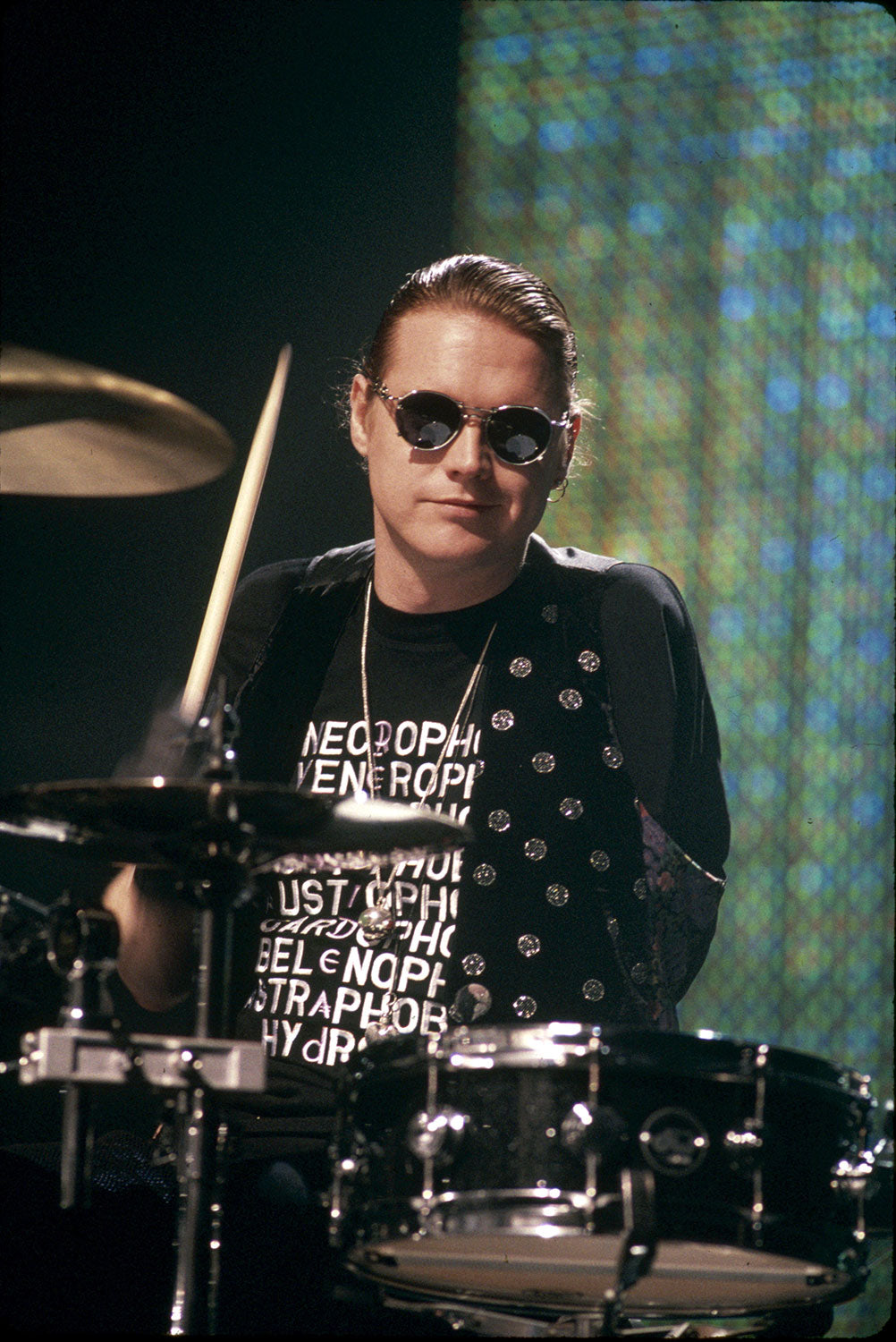 Rick wears all-black for this Slang promotional photo shoot, 1996. From the Collection of Def Leppard