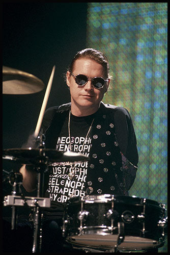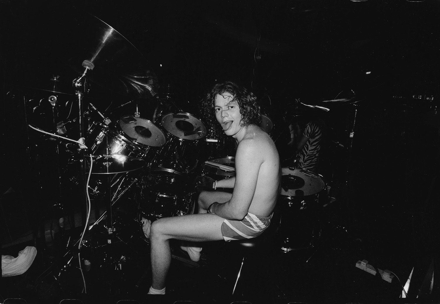 Rick at his drum kit on "Foolin'" video set, Elizabeth, New Jersey, June 1983. From the Collection of Def Leppard.