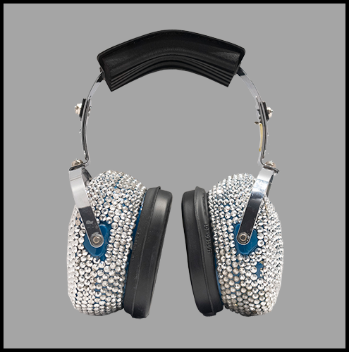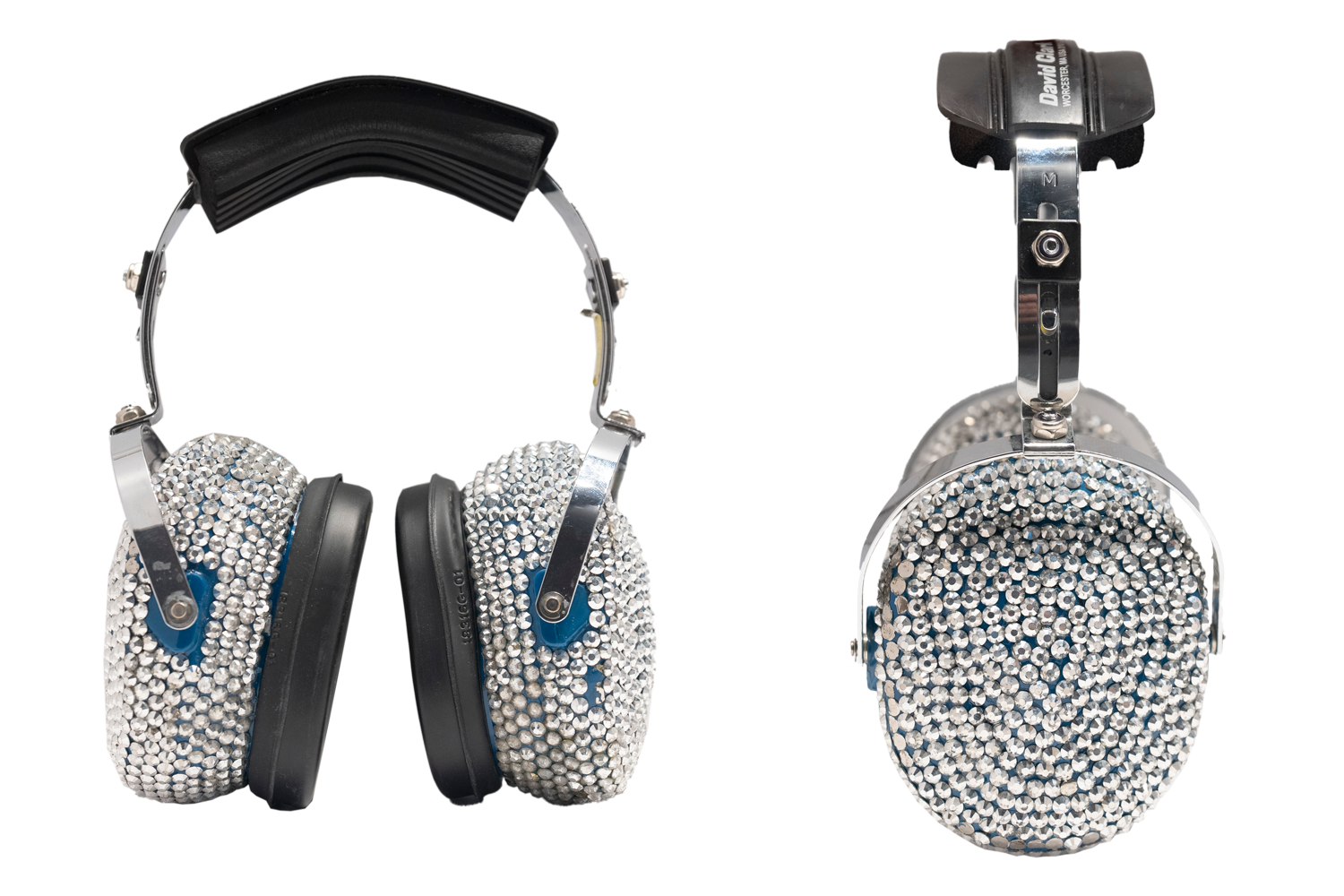 A pair of Rick's David Clark headphones used for performance. The headphones allow Rick to hear drum loops he's triggering. This gives room for him to improvise and create extremely complicated percussive elements live. From the Collection of Rick Allen.